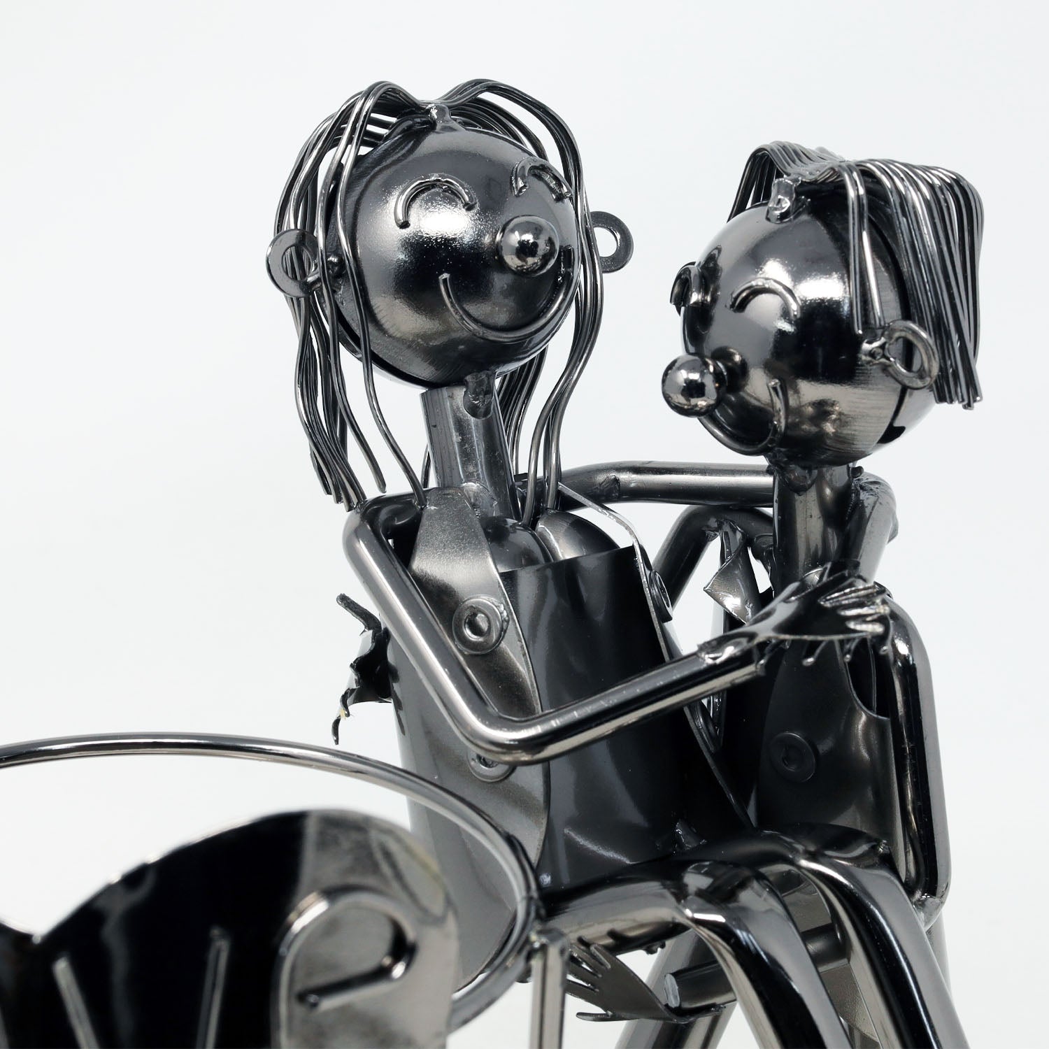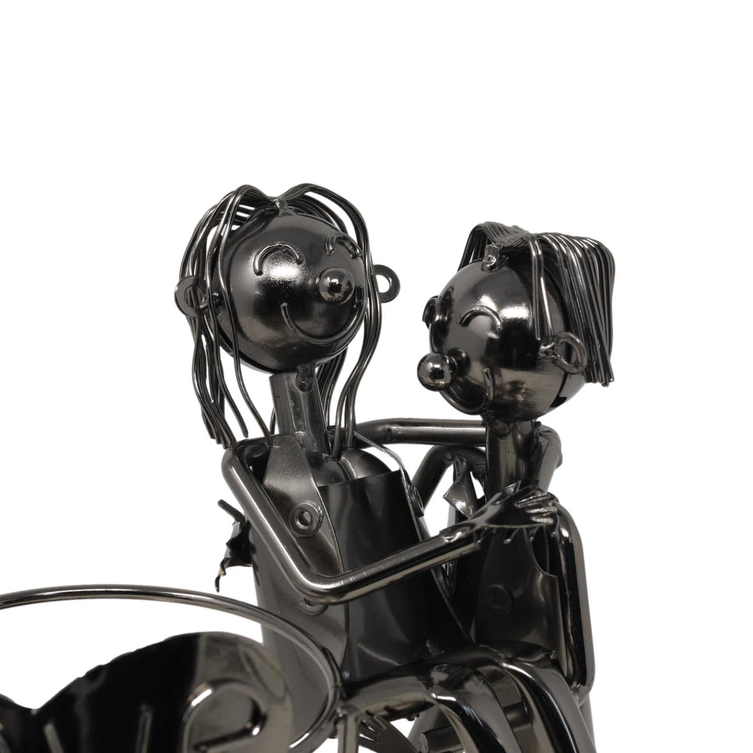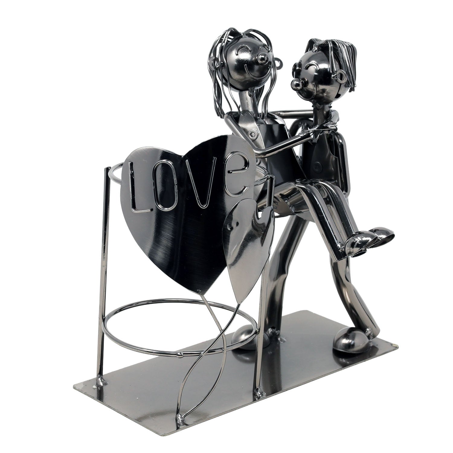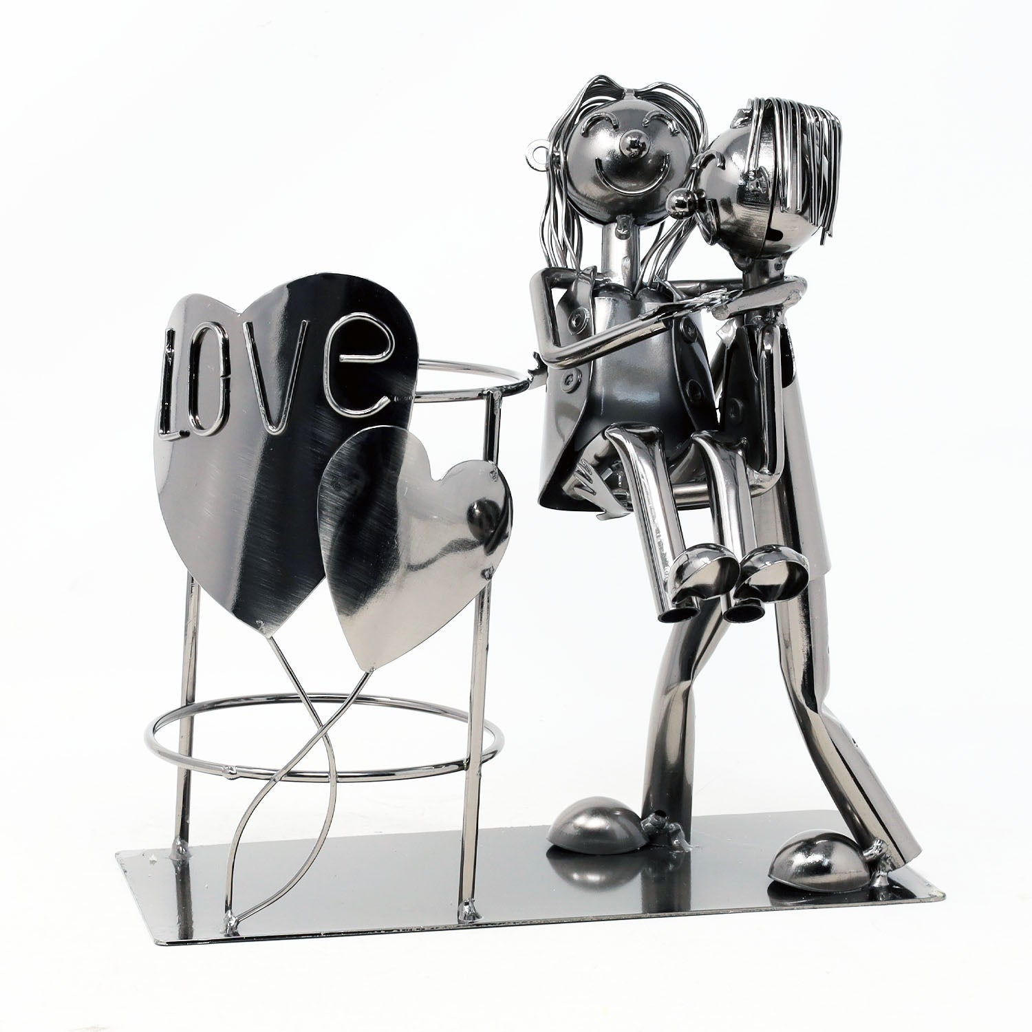 Bring a touch of romance and creativity to your home décor with this elegant holder for metal wine bottles. Featuring a charming couple embracing next to two heart designs with the word "LOVE", this piece beautifully combines functionality and art.