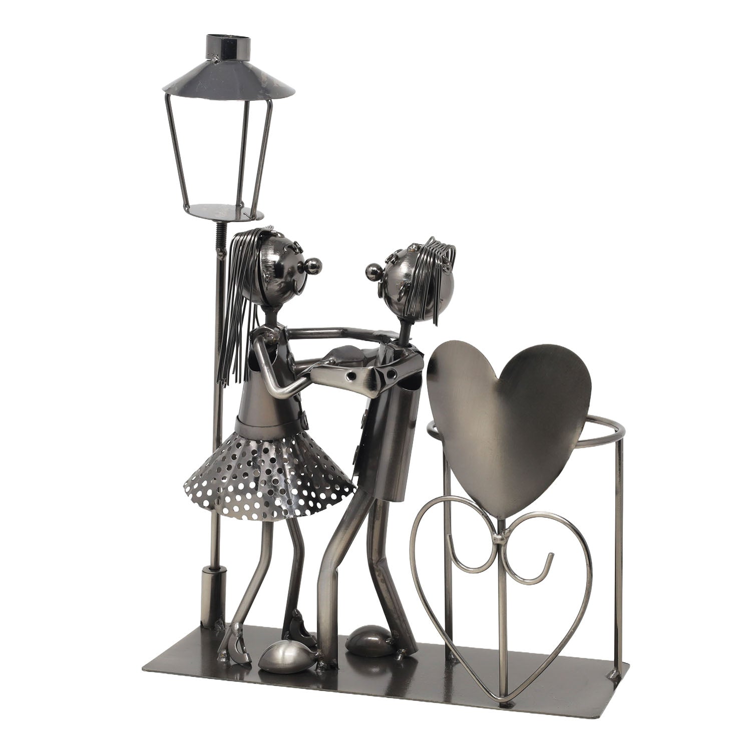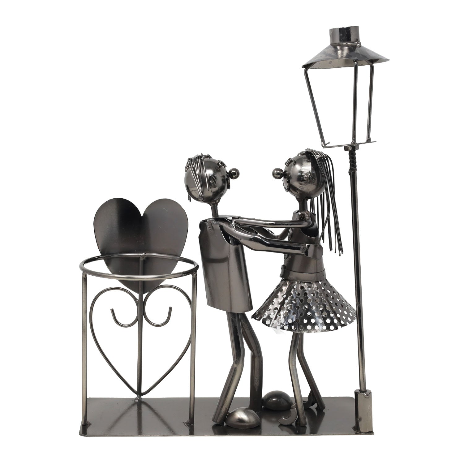 - Beautiful handcrafted metal wine bottle holder with a romantic dancing couple design.