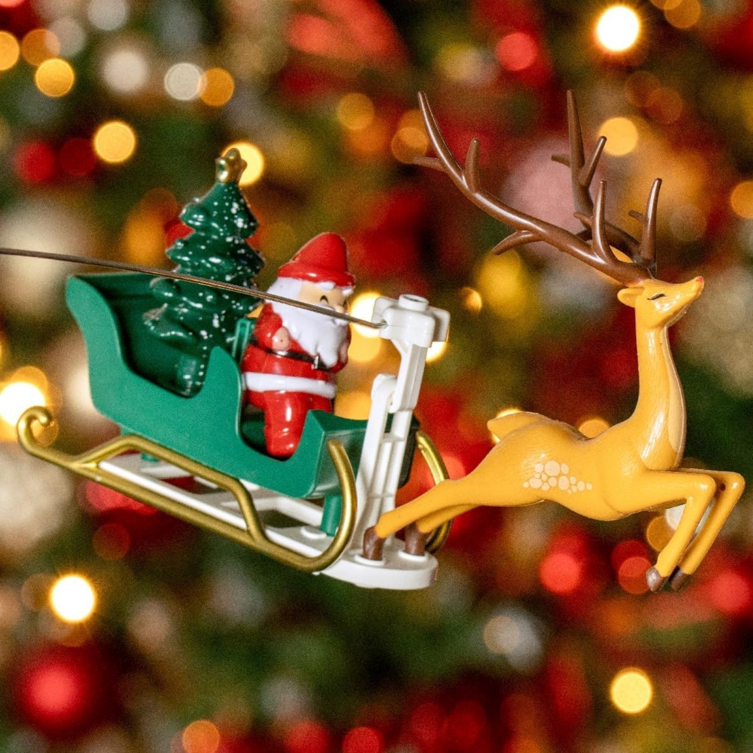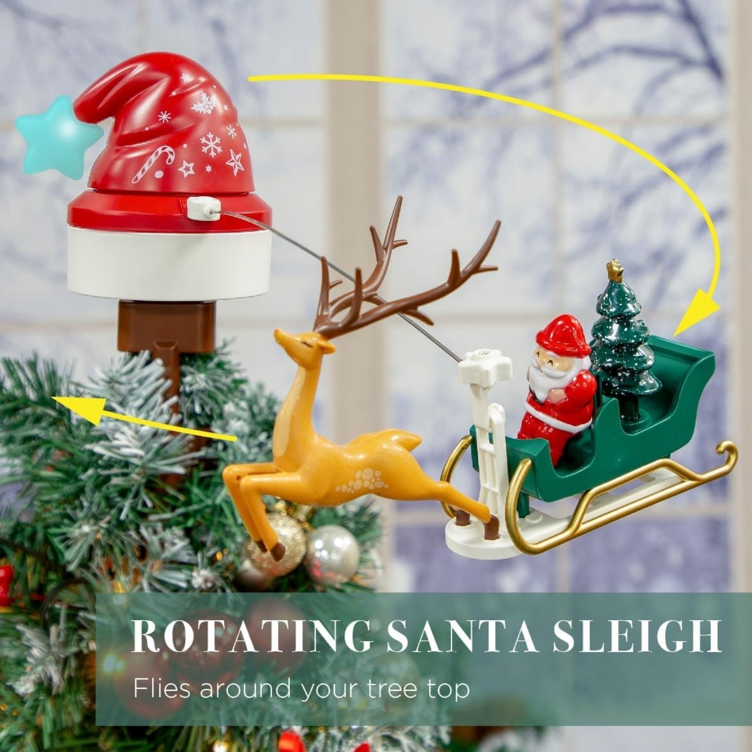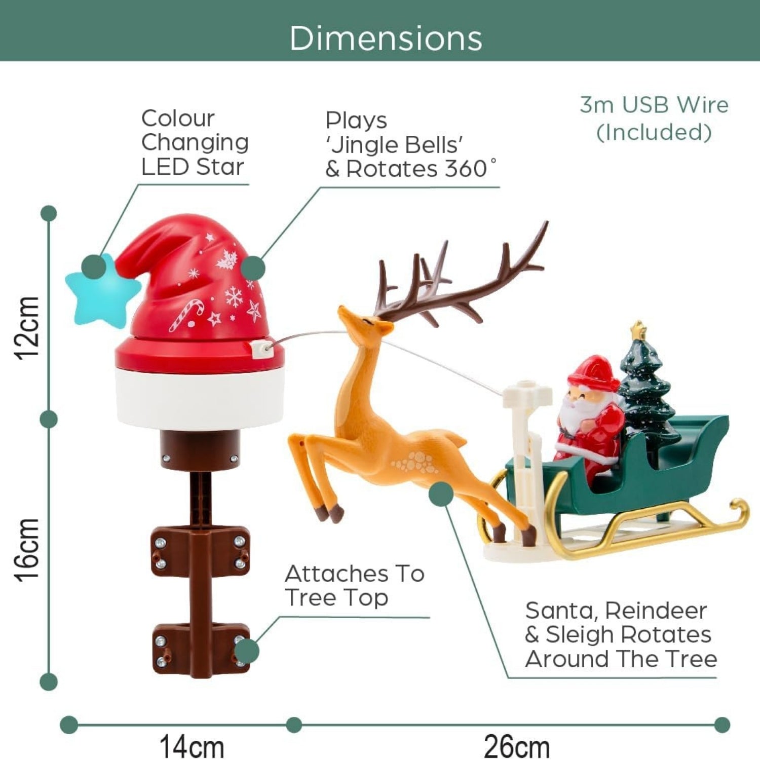 - Features a rotating function and includes Santa and, reindeer sleigh.