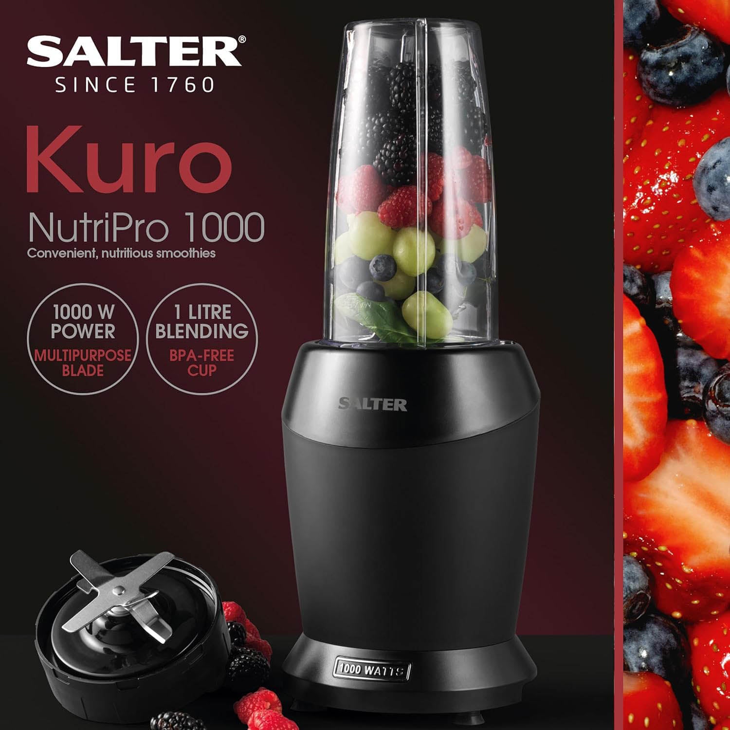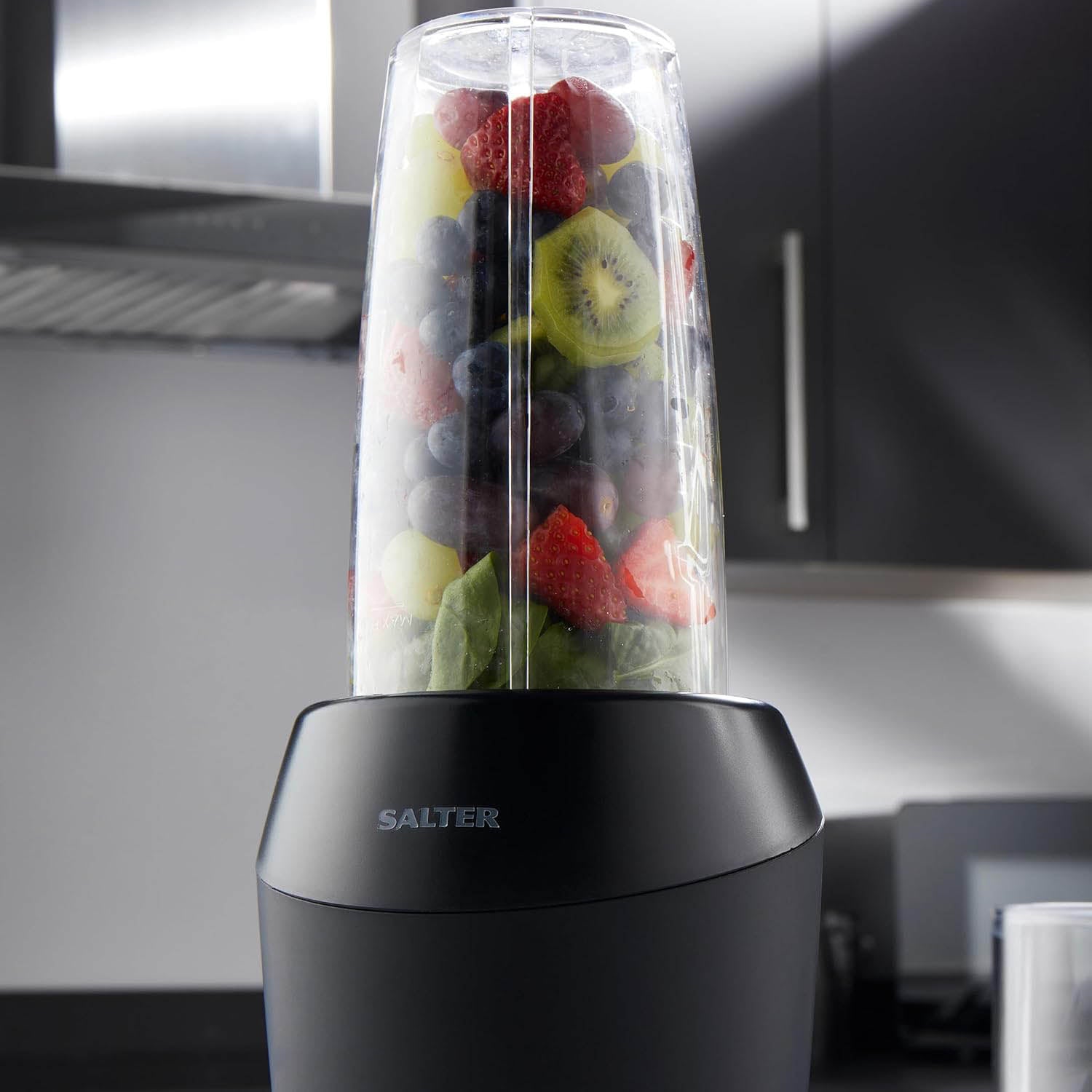 Create delicious smoothies and protein shakes loaded with superfoods to boost your immune system with this Kuro NutriPro. Sleek and modern, the Salter Kuro collection is all you need for any modern kitchen. With a powder-coated matte black finish, this collection includes food mixers, blenders, microwaves, slow cookers, a kettle and toaster, a health grill, and countertop essentials.