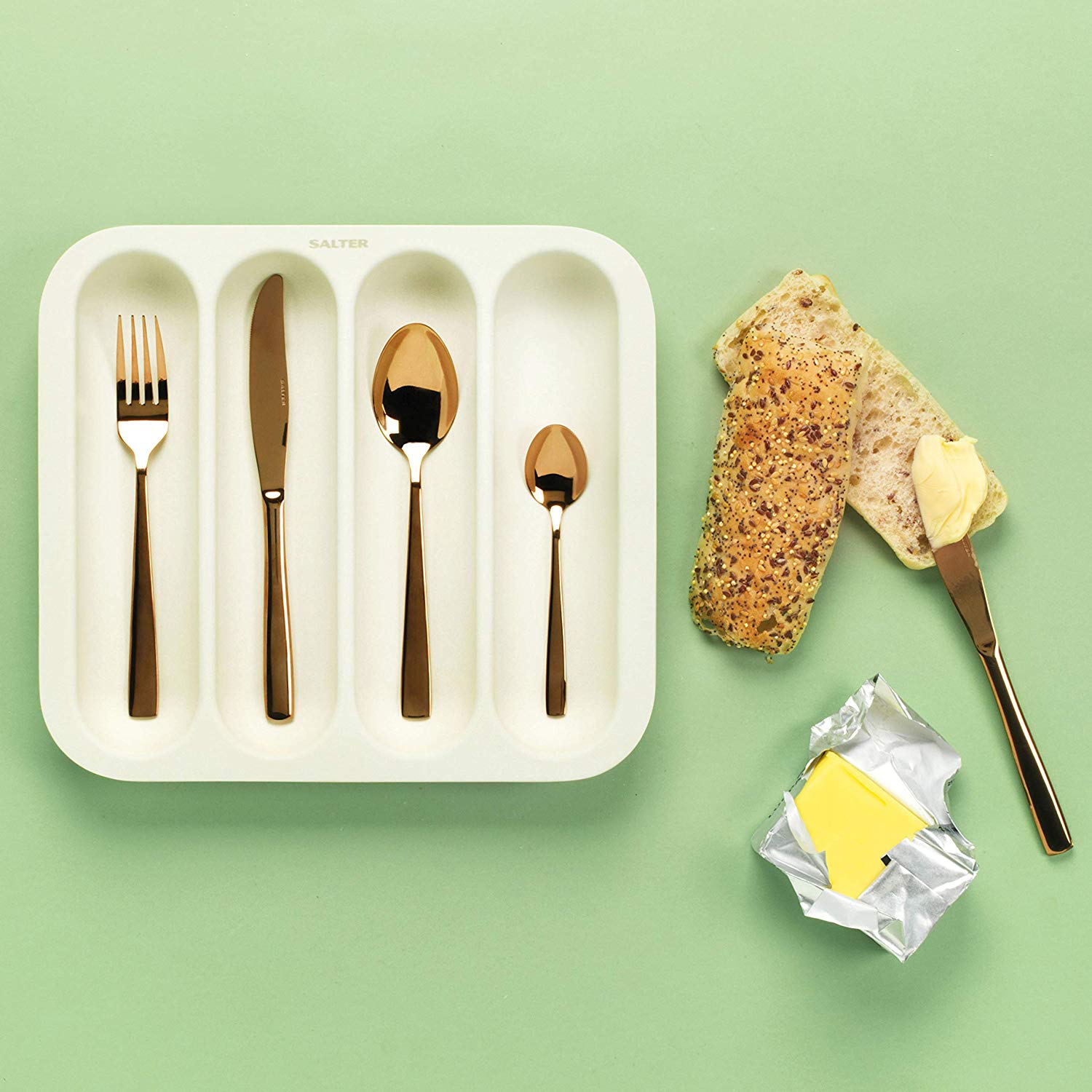 Sturdy, lightweight and kinder to the environment than plastic dividers, this Salter Earth cutlery tray is great for keeping all your knives, forks and spoons neatly organised. Made from natural bamboo fibre, the dishwasher-safe tray comprises four equally sized compartments so you can arrange your cutlery as you like, and at 31 x 28 cm it will fit snugly inside most kitchen drawers. This versatile unit has a natural wooden finish that will blend in no matter what your chosen kitchen aesthetic.