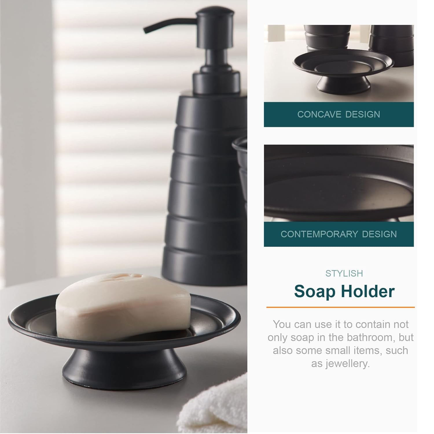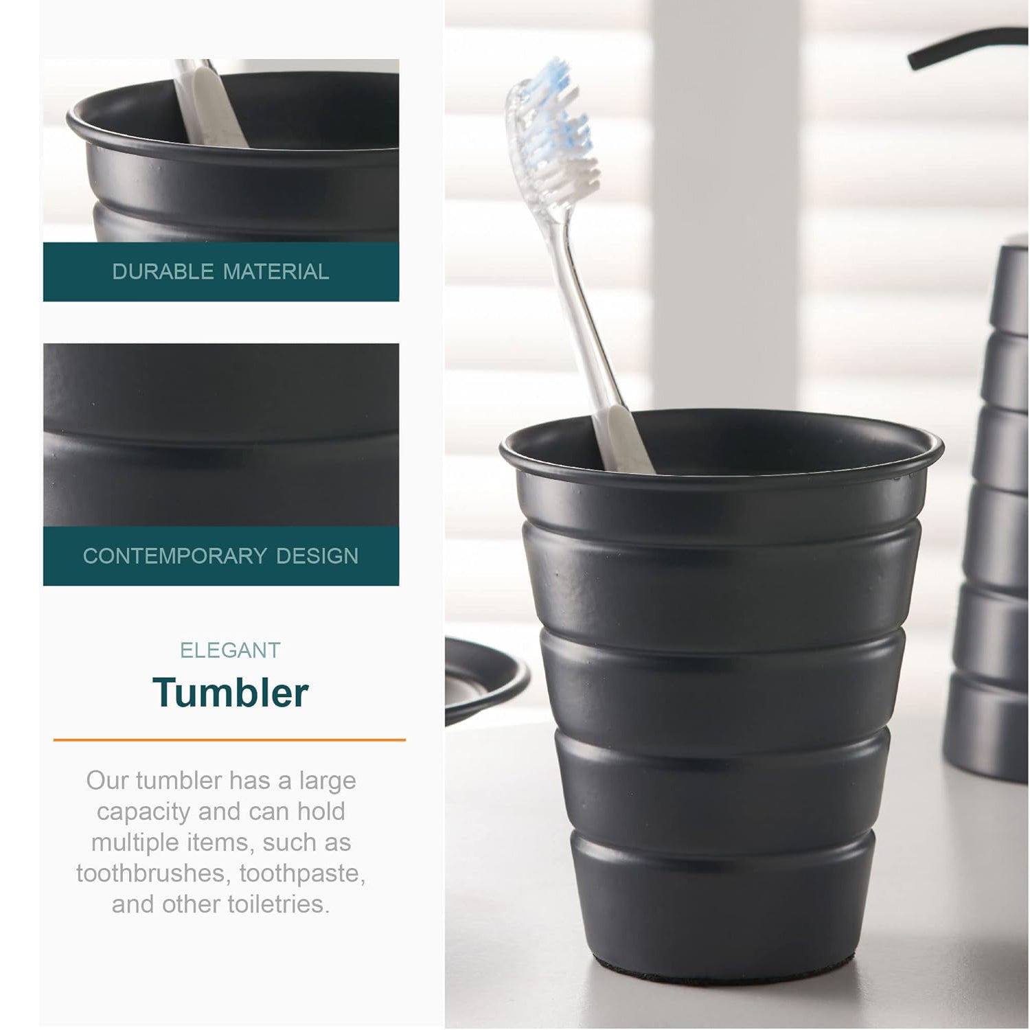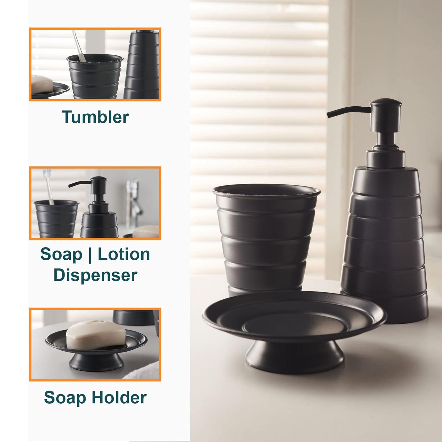 - Includes soap dispenser, tumbler, and matching soap dish.