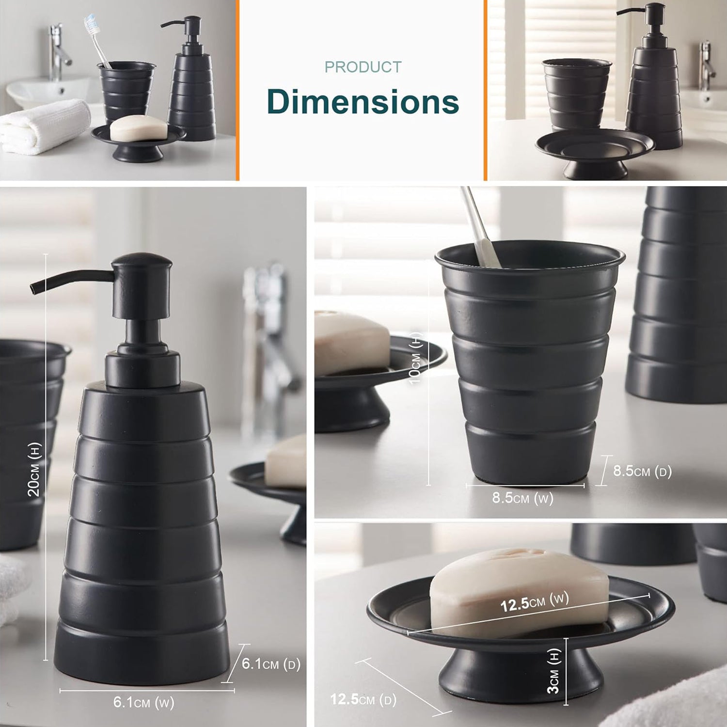 - Approx. Product Dimensions: Soap dispenser - L: 7.5 x W: 7.5 x H: 18 cm, Tumbler - L: 8.5 x W: 8.5 x H: 10 cm, Soap dish - L: 12.5 x W: 12.5 x H: 3 cm