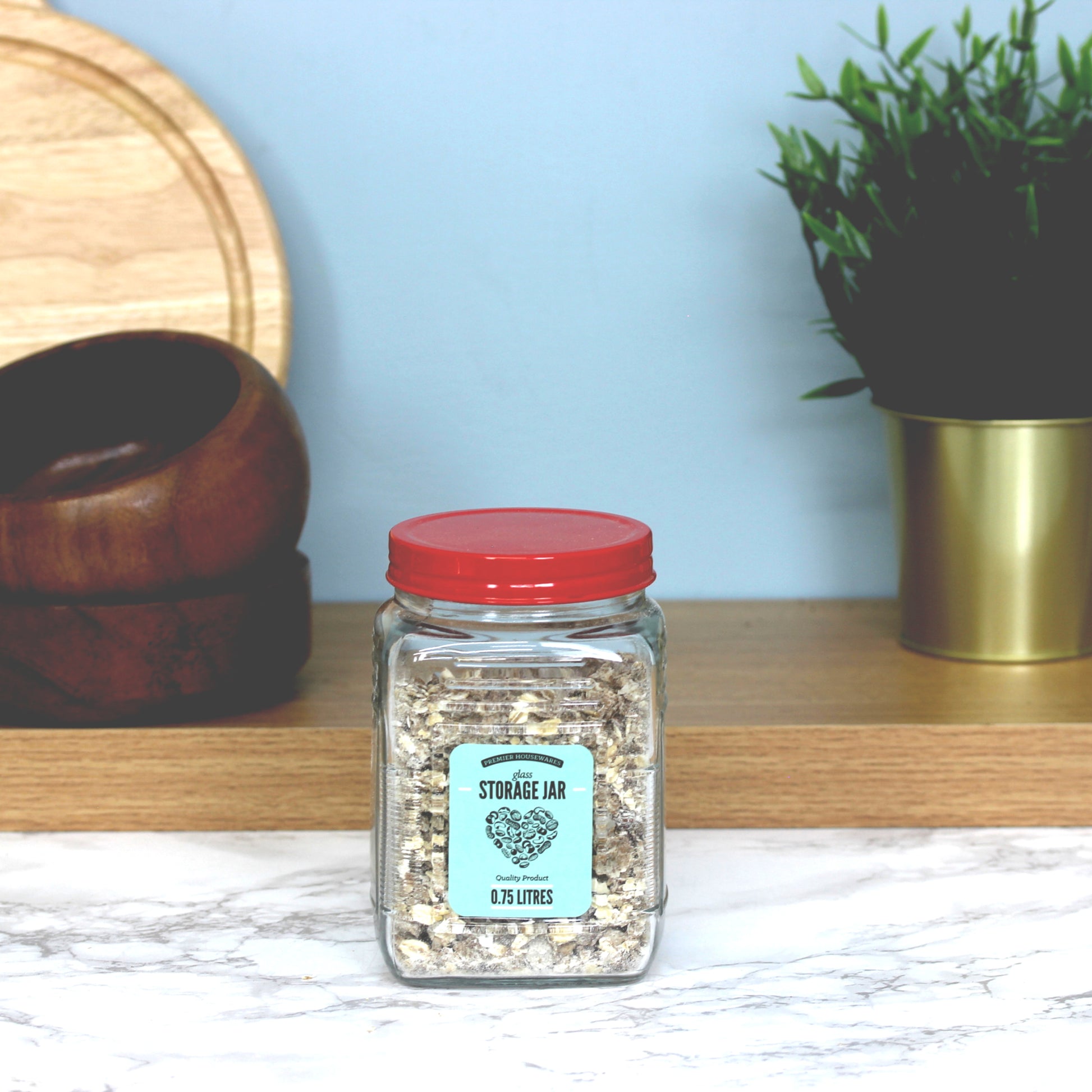 The transparent 750ml jars make it easy to see loose products inside, like lentils or flour. Notched edges mean they can be lifted without fear of slipping, and identifying labels can be stuck on the flat surfaces on each side. The tight seal makes them great for storing homemade jams or preserves. Colorful iron lids differentiate each jar.