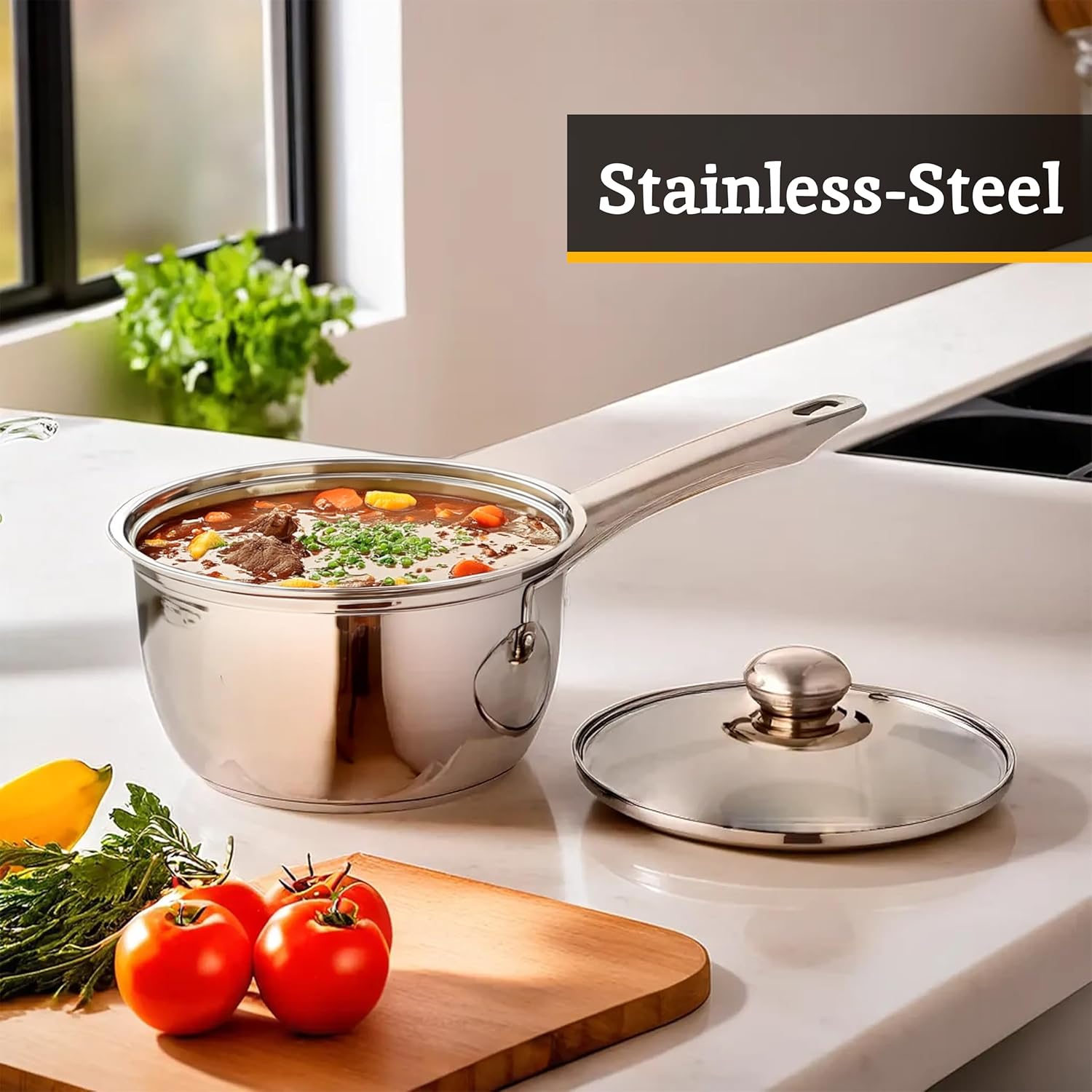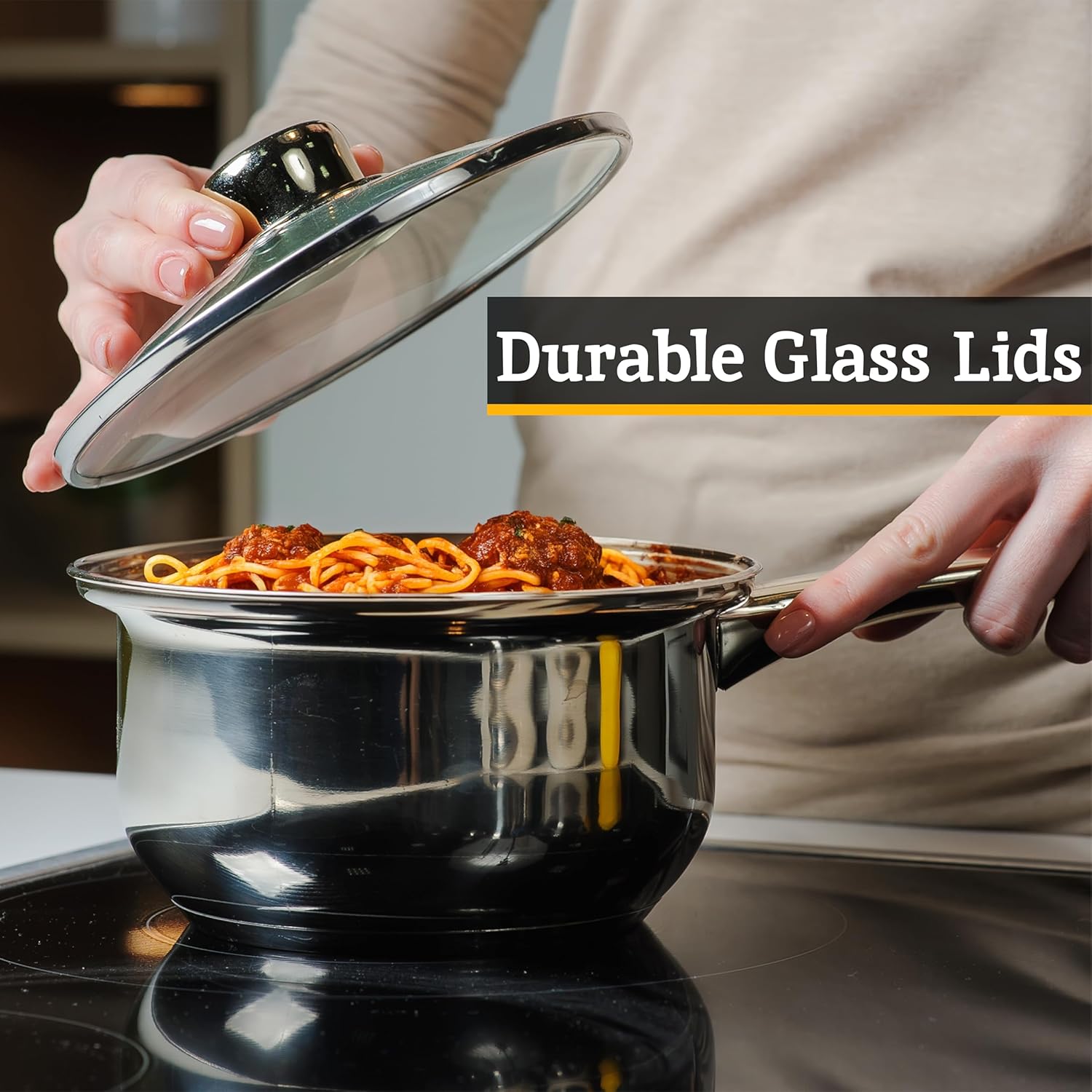This 3pc stainless steel pan set has durable glass lids which help to keep meals hot and perfectly cooked.