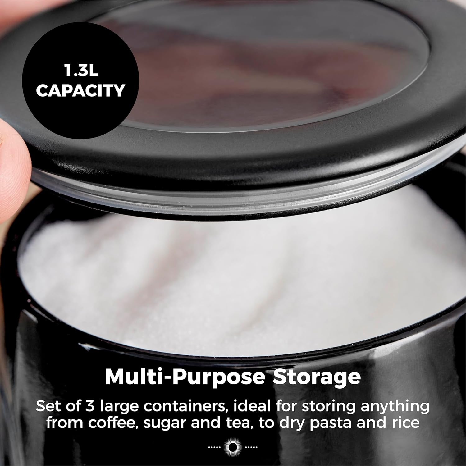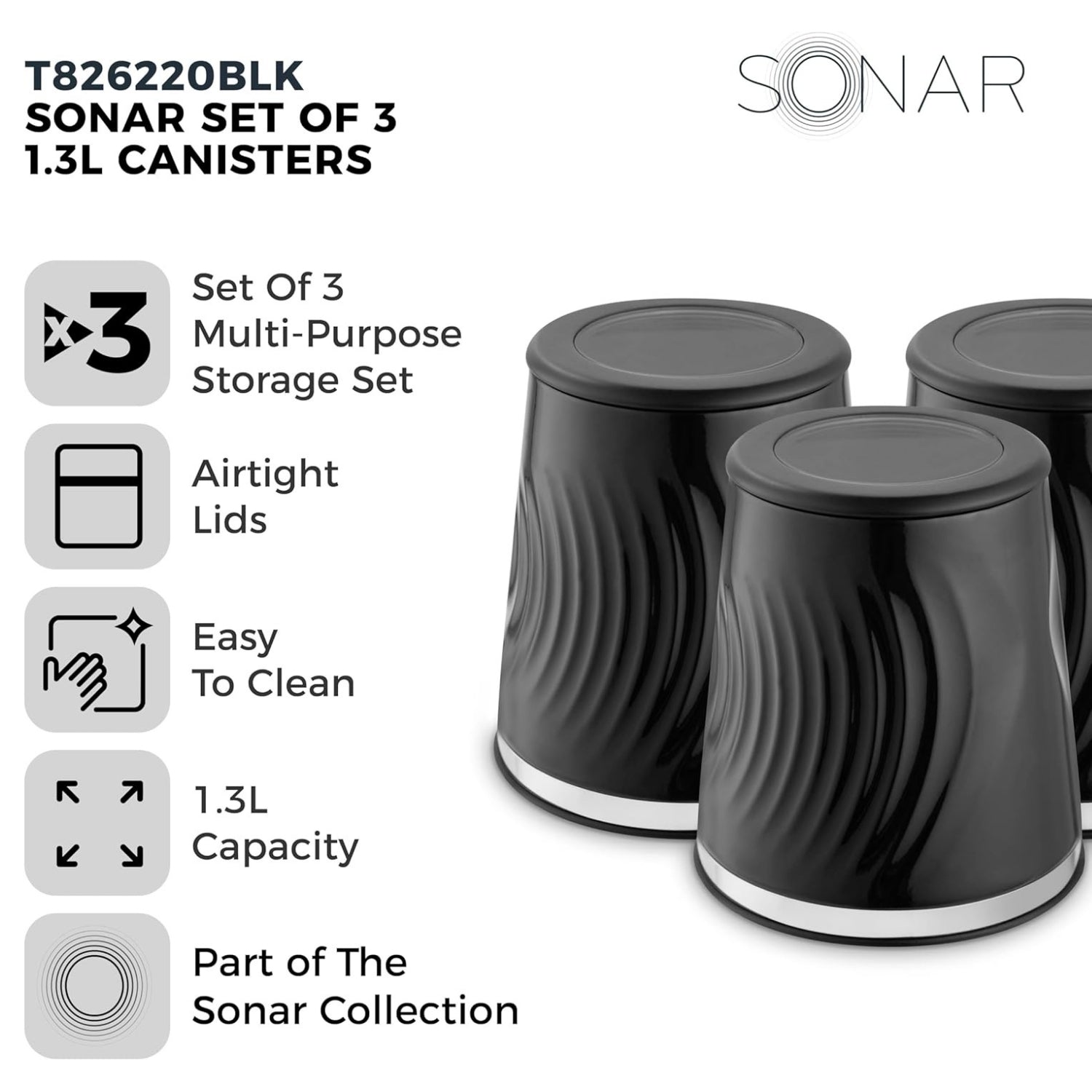 The Tower Sonar Set of 3 Canisters offers a stylish and practical storage solution for your kitchen essentials. Designed with a contemporary textured ripple pattern and a sleek black finish, these canisters add a touch of elegance to your countertop. Each canister features an integrated viewing window, keeping your tea, coffee, sugar, or other dry goods fresh while allowing you to see the contents at a glance.