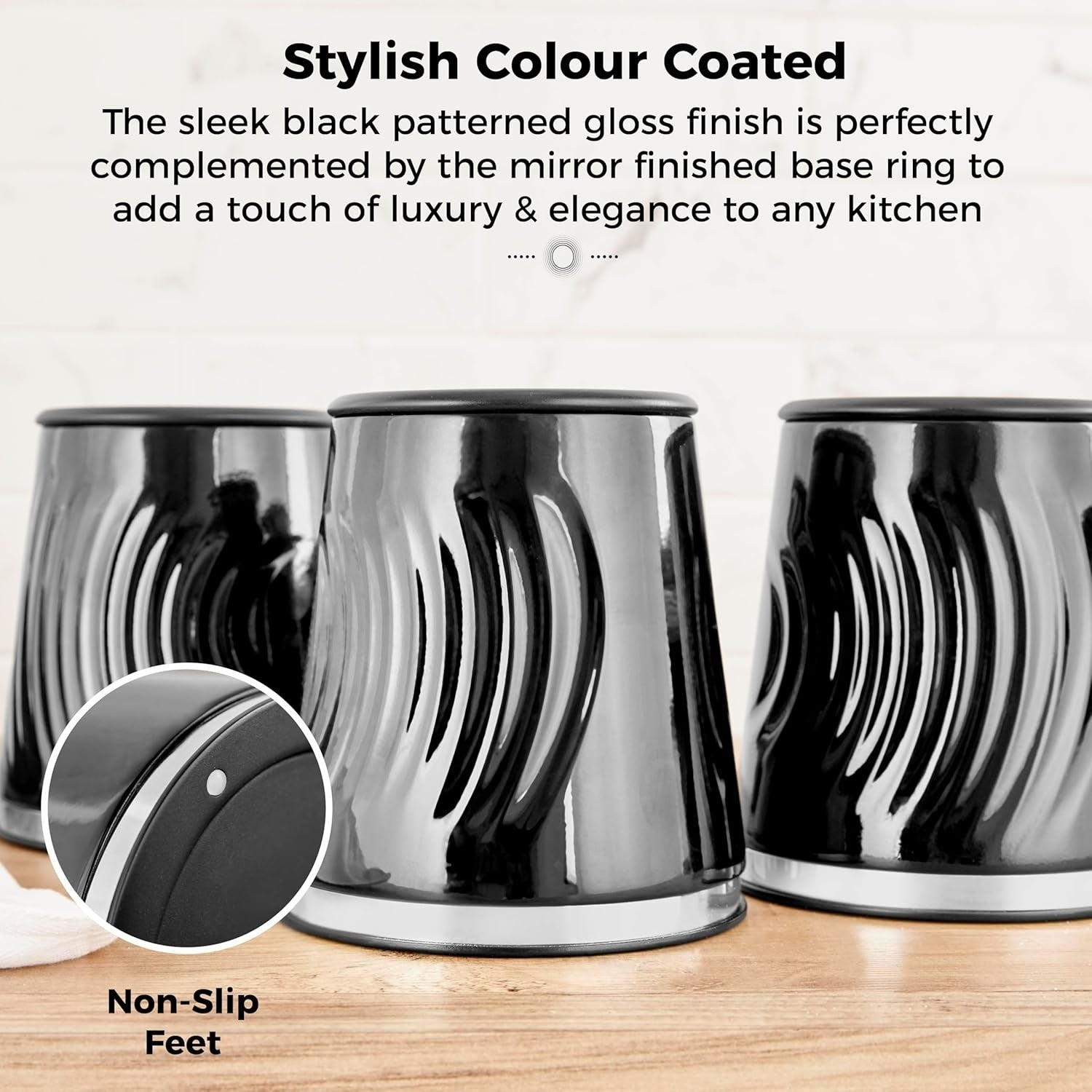 - Stylish textured ripple design with sleek black finish for a modern kitchen look.