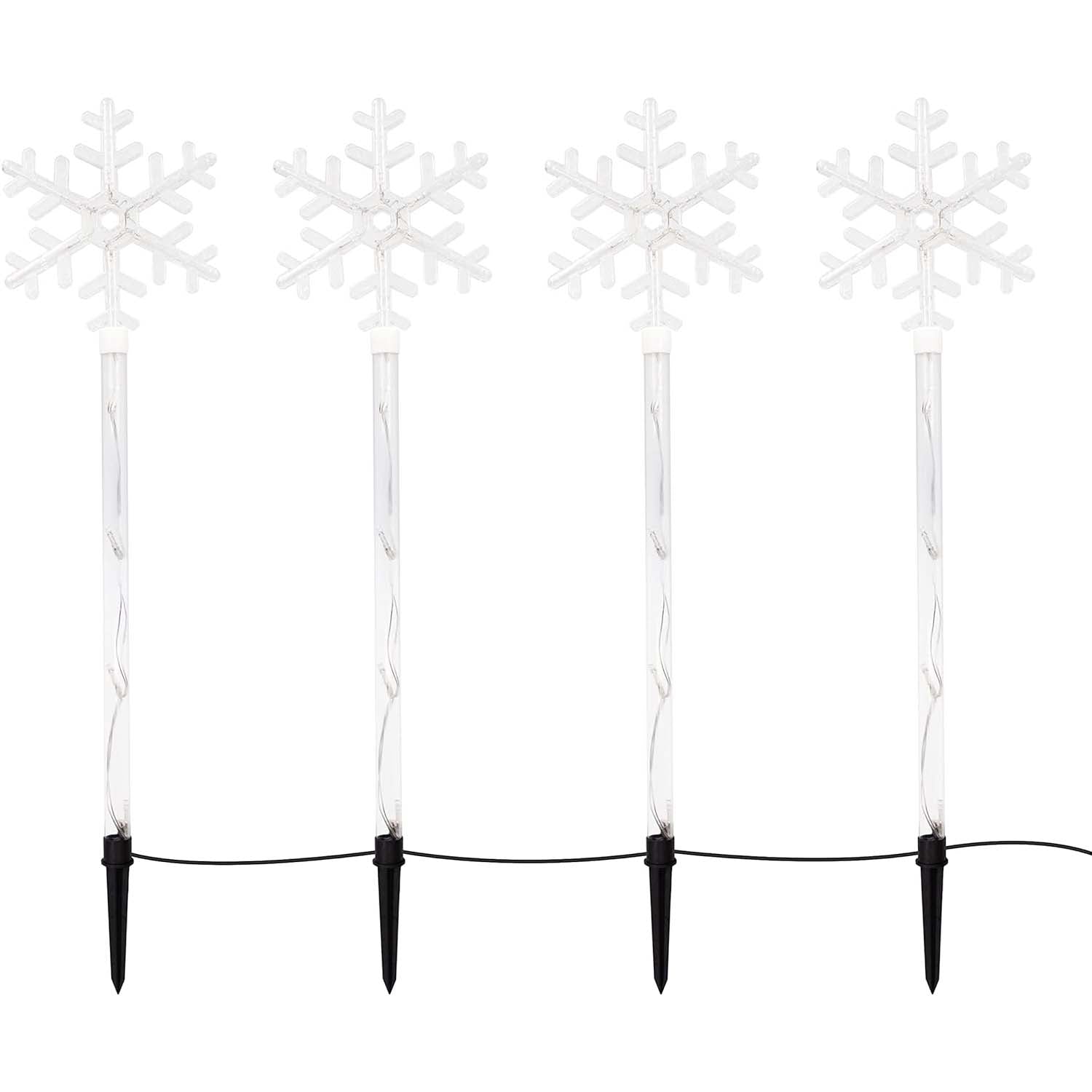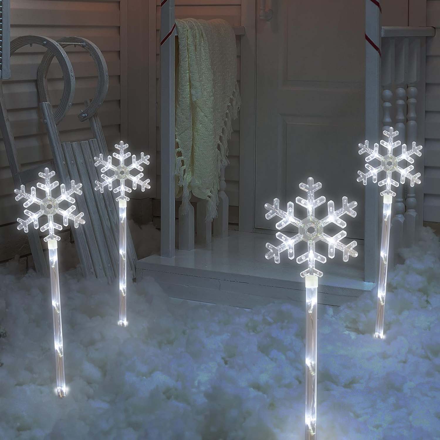 - Each of the 4 light-up snowflake Christmas lights feature 10 LED light bulbs that provide a stunning glow in the evening. Have them line up along the driveway, footpaths, borders and flower beds.