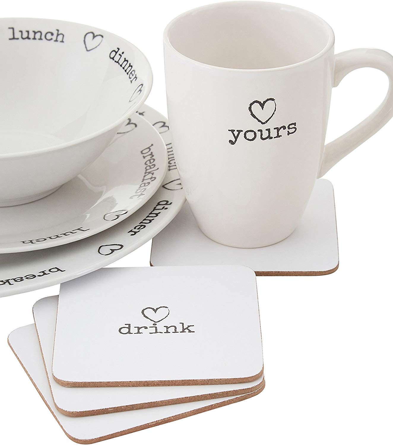 These coasters can be styled with the Charm placemats to create a coordinated look at the dinner table. Their white finish makes the heart graphic and "drink" lettering stand out, the design protected by a layer of PVC. Made from sustainable cork, each one is resistant to water. Use them to keep glass and wooden table surfaces in pristine condition.