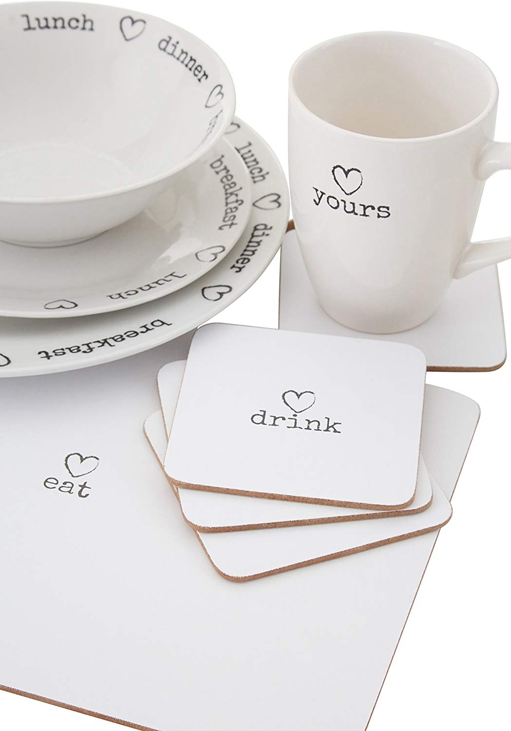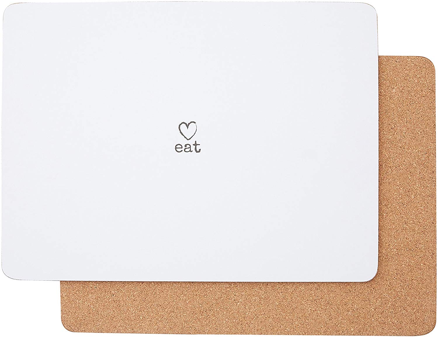 Bringing a kindly touch to your table, the beautifully designed set of 4 Charm placemats featuring love heart detail and a white finish will delicately match all decors. Made using lightweight yet durable cork, the stylish mats wipe clean with ease making them suitable for breakfast, lunch, or dinner. The placemat's simple and elegant love heart design, with the word 'eat' text, adds charm to your table while ensuring the surface is safe from accidental splashes, spillages, burns, and scratches. Ideal for everyday use, the set of 4 Charm placemats will make a welcome addition to your daily routine.