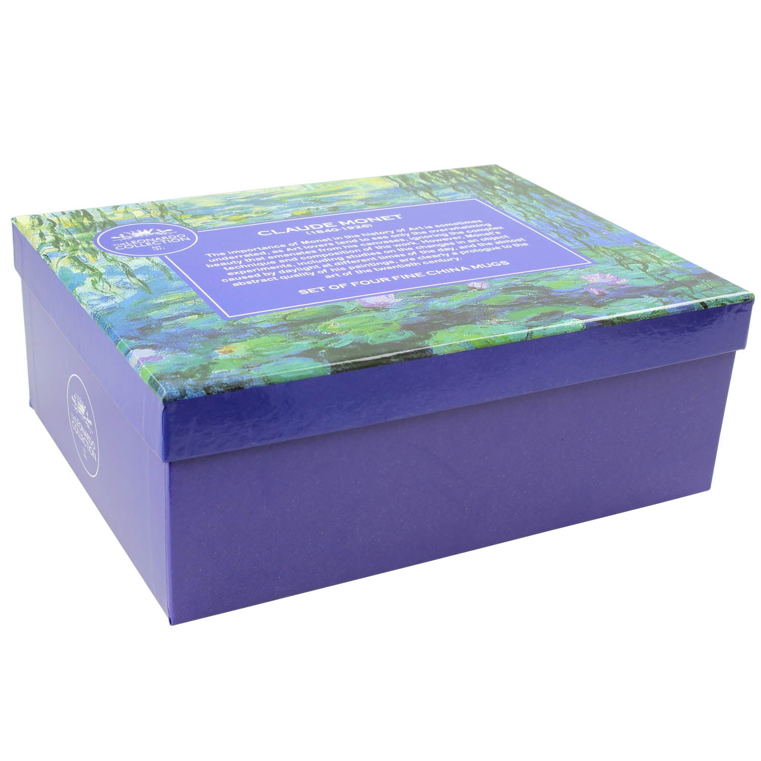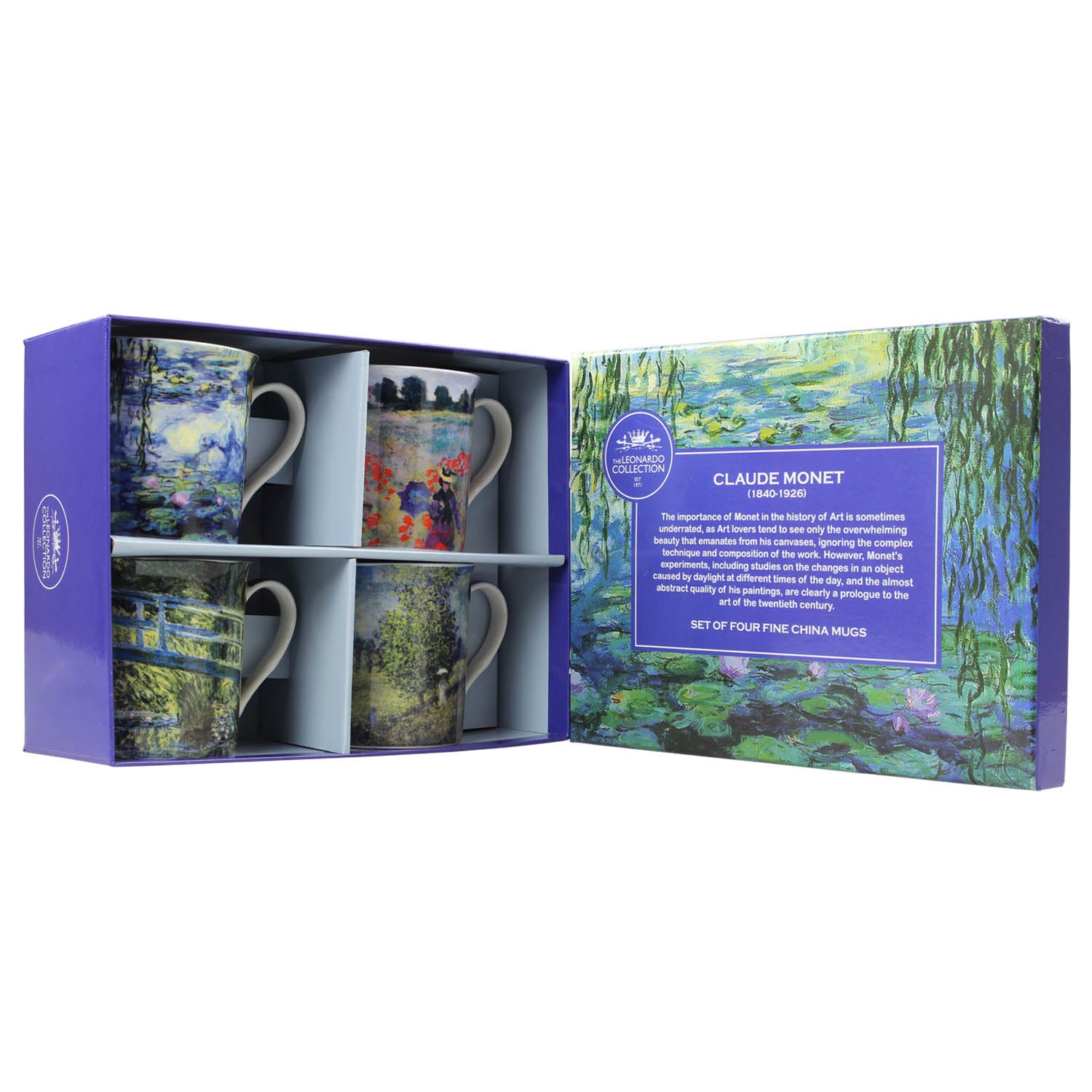 Serve your favourite tea or coffee with this beautiful set of four fine china mugs. Each mug shows a different painting by the great master painter Claude Monet, including some of his most famous: "Poppy Field," "Water Lilies and the Japanese Bridge," and "In the Garden." dishwasher and microwave safe. It comes in a presentable gift box. ideal gift for your friends and loved ones. Capacity: Approximately 227ml each mug. Product Dimensions: Approx. 12 x 8 x 9 cm recommended for handwashing only.