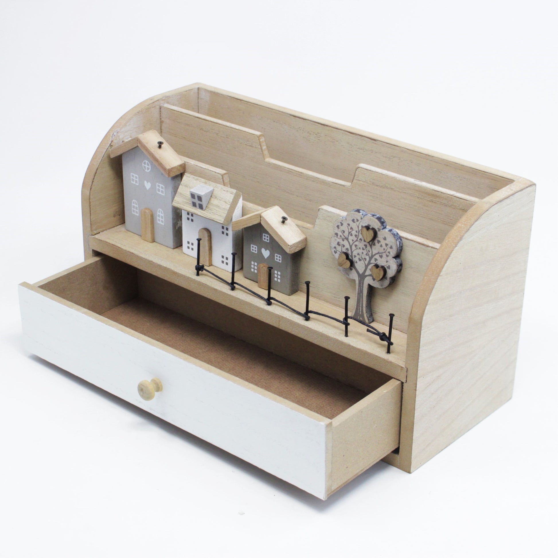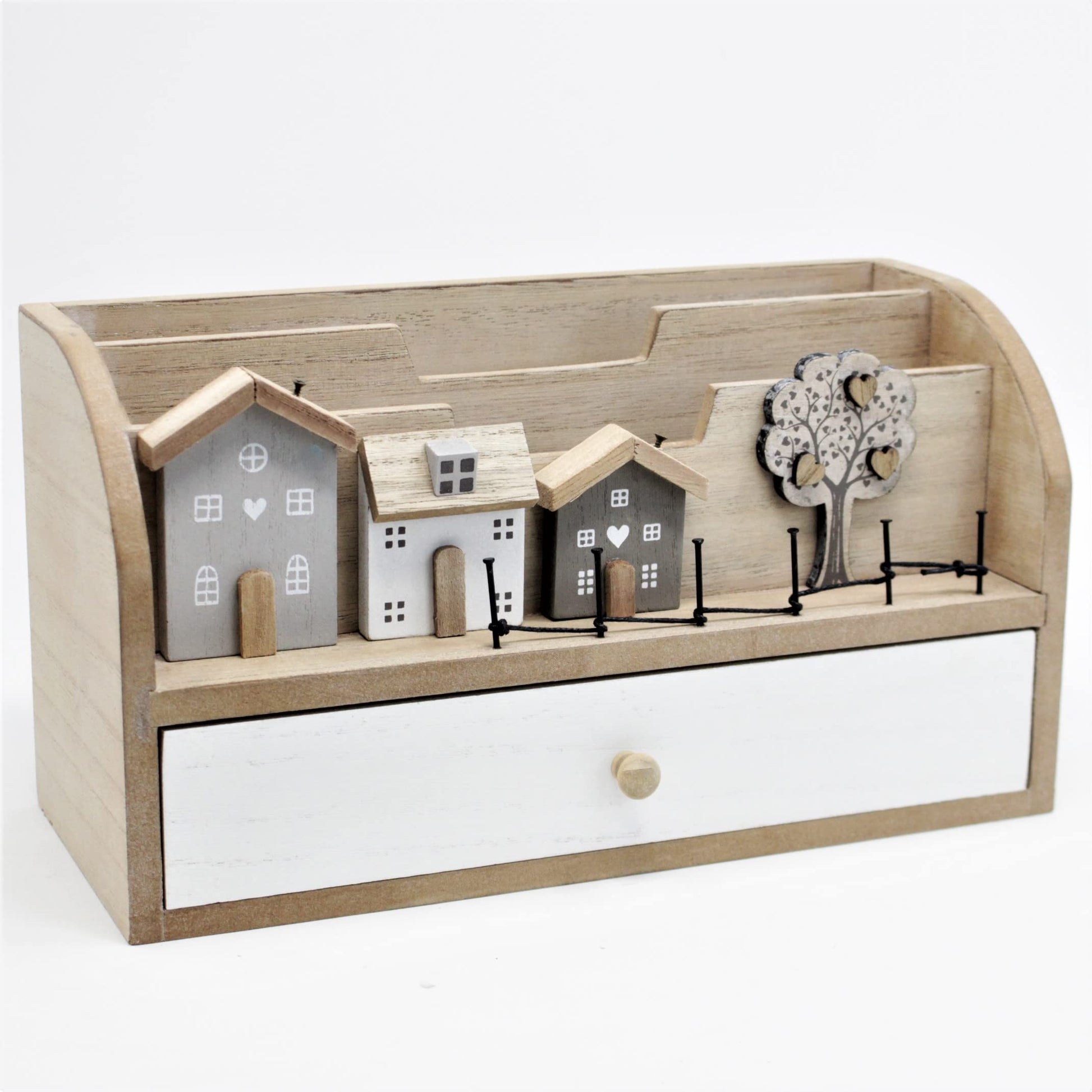 A beautifully made Wooden Letter Rack with cute little wooden houses lined up and tree design with railings. Perfect for a hallway or home entrance, with a handy storage drawer and open dockets for letters.