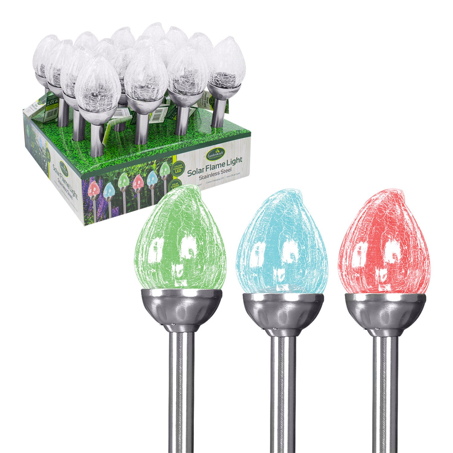 Decorate and beautify your garden with this solar powered Flame LED light. Automatically turns on at dusk. No wirings are needed so it can be installed anywhere in your garden. Uses 1 x Colour changing LED. Includes a rechargeable 1 x AA battery and an On/Off switch. Product Dimensions: Approx. 8 x 8 x 42cm.