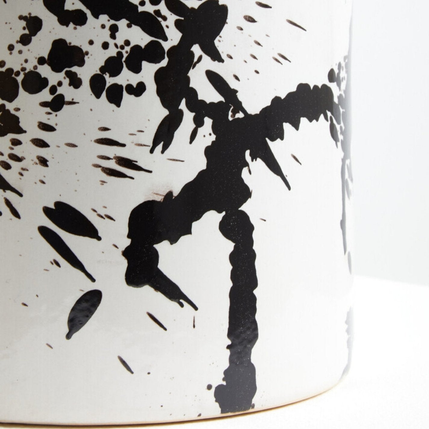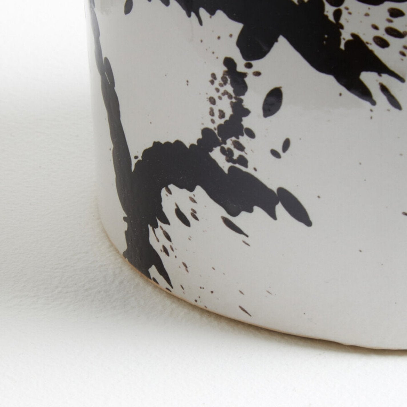 The Sorrelle large ceramic planter showcases a bold balance of minimalism and artistry, perfect for contemporary and urban interiors. Hand thrown from premium quality ceramic, it features a striking black paint splash effect across a smooth white glazed surface. With its sturdy drum-shaped design, this planter serves as a playful yet stylish way to display flowers or greenery while adding character to any space.