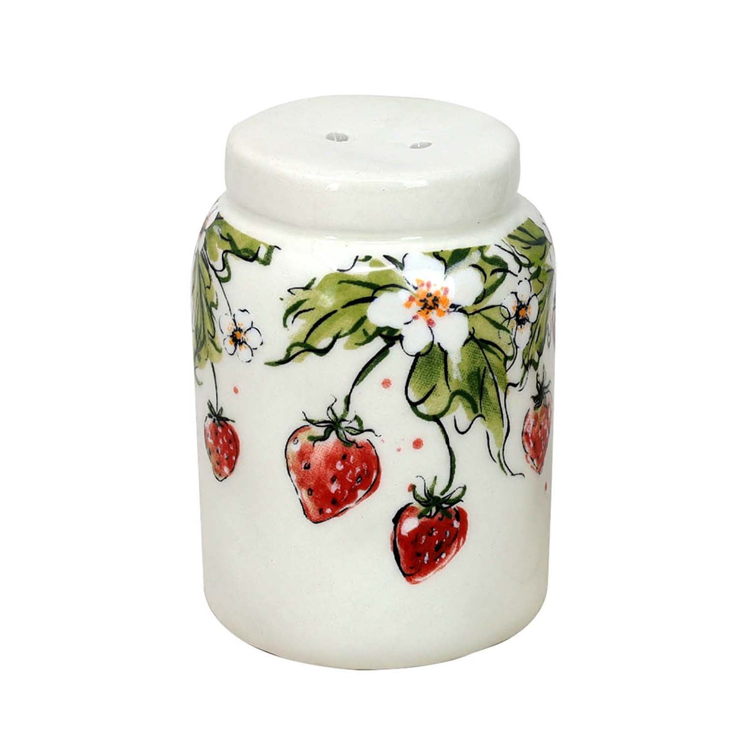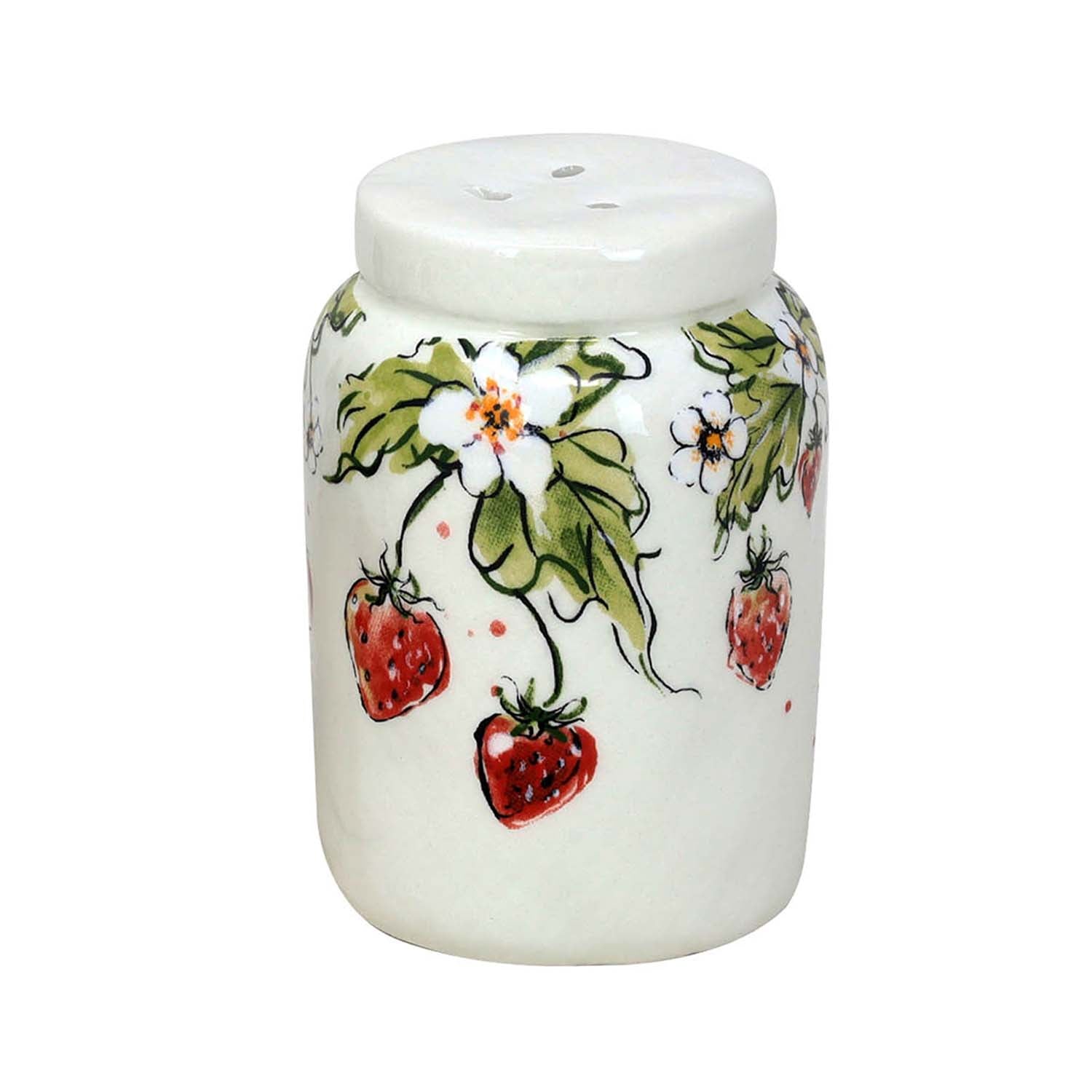 Enhance your dining table with this ceramic cruet set featuring a delightful strawberry and leaf print. Measuring 8.5cm tall, the white glazed shakers offer both function and charm, ideal for seasoning your meals. Hand wash only; not microwave or dishwasher safe.