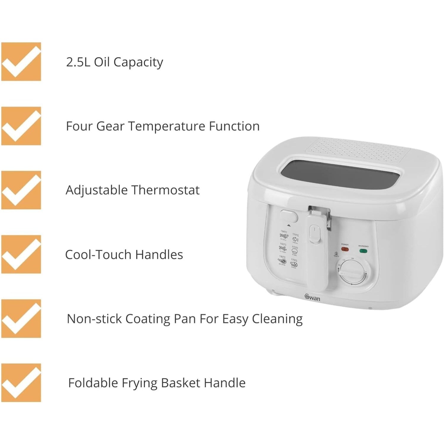Prepare healthier fry foods for your family with the Square White fryer from Swan. With a 2.5 Litres capacity and four gear temperature functionality, this fryer is great and efficient way to prepare deep-fried food including chips, chicken, spring rolls, fish and more. A fixed oil container and cool-touch handles are included for safety during use and a non-stick pan ensures post-use clean-ups are easy.