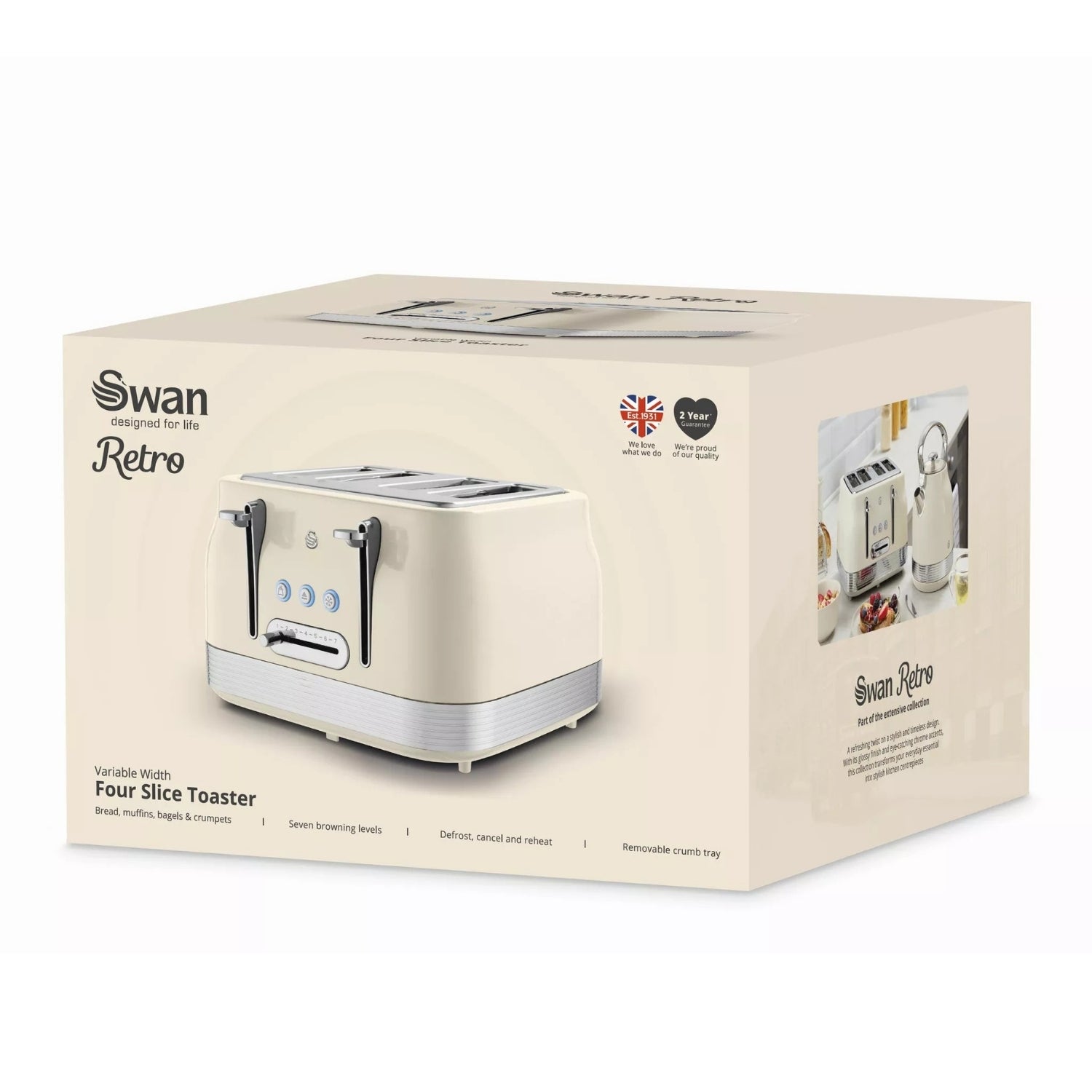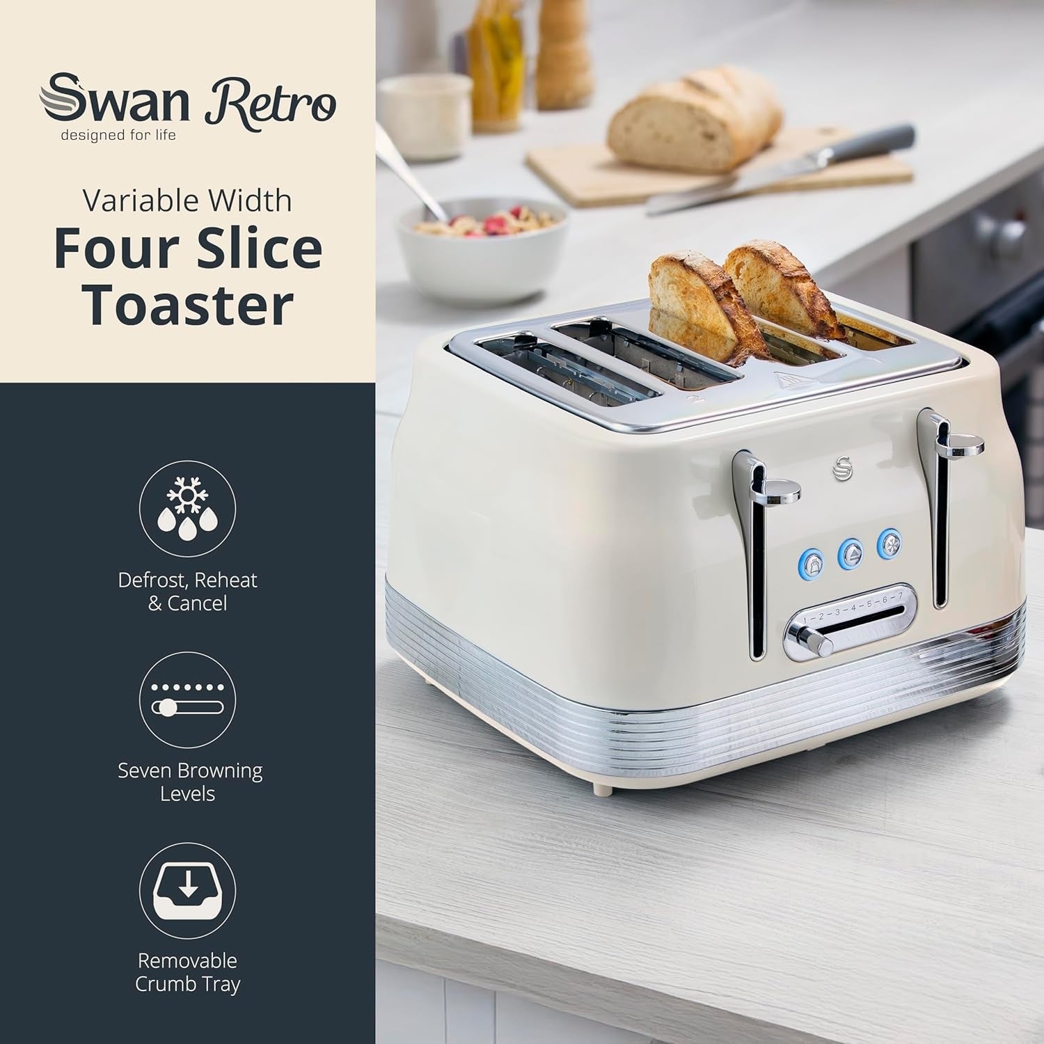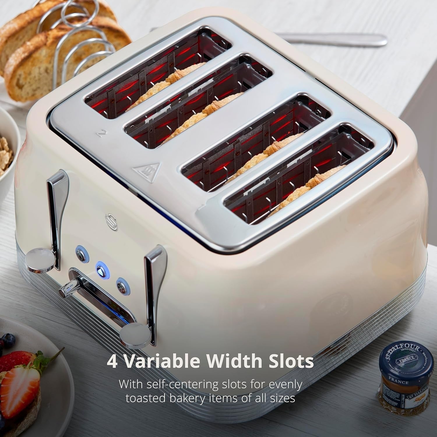 Toast for the whole family in style with the Swan Retro 4-Slice Toaster in elegant Chantilly Cream. Its self-centering slots and dual independent controls allow you to toast different breads simultaneously with even results. The unit also features an automatic shut-off for peace of mind. This cheerful kitchen essential combines retro charm with modern functionality.