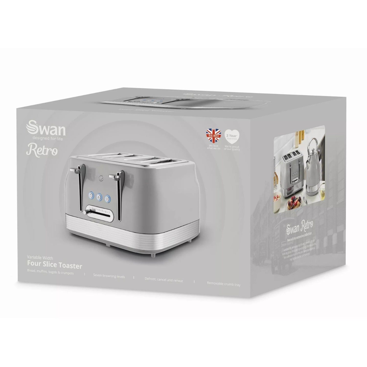 Toast for the whole family in style with the Swan Retro 4-Slice Toaster in elegant Grey. Its self-centering slots and dual independent controls allow you to toast different breads simultaneously with even results. The unit also features an automatic shut-off for peace of mind. This cheerful kitchen essential combines retro charm with modern functionality.