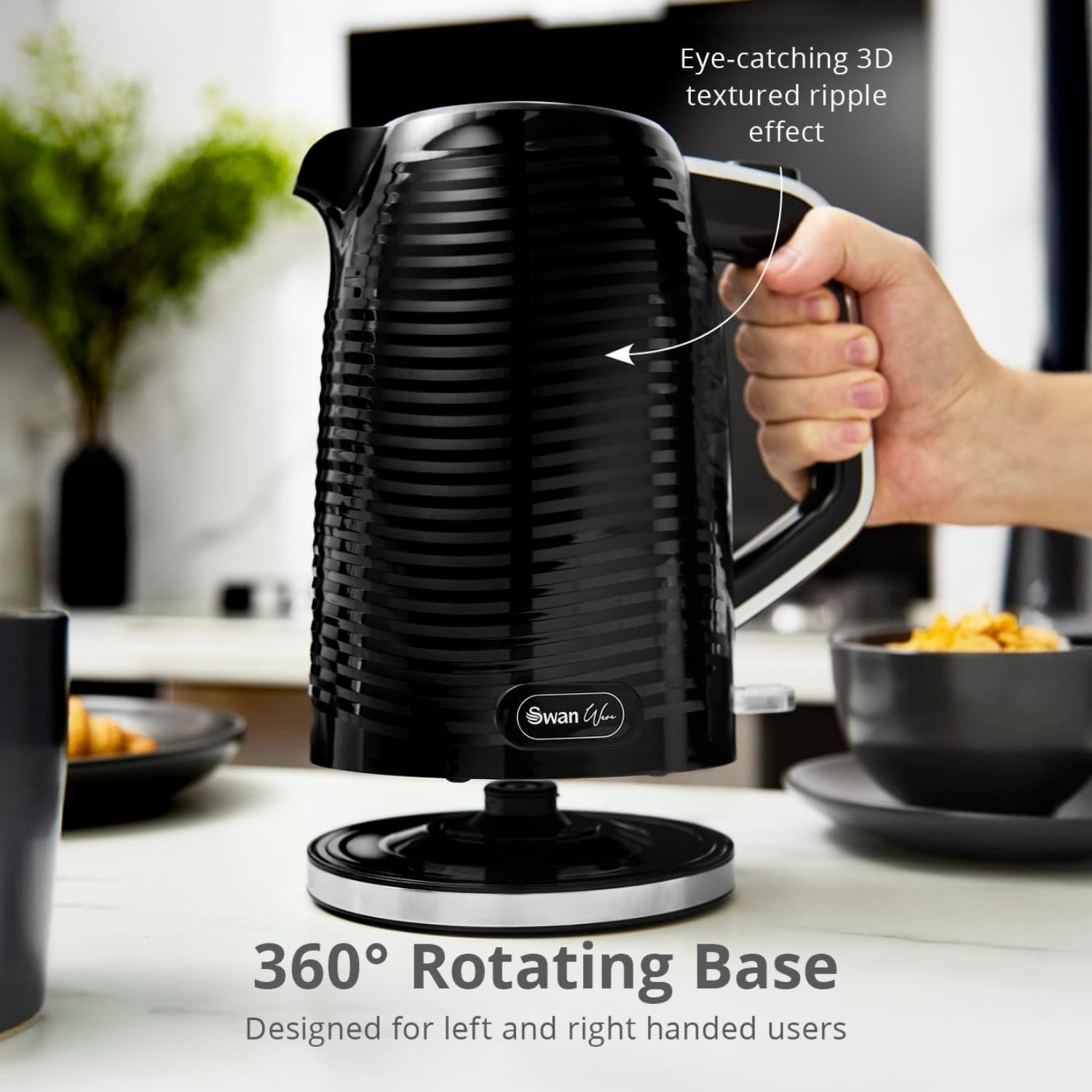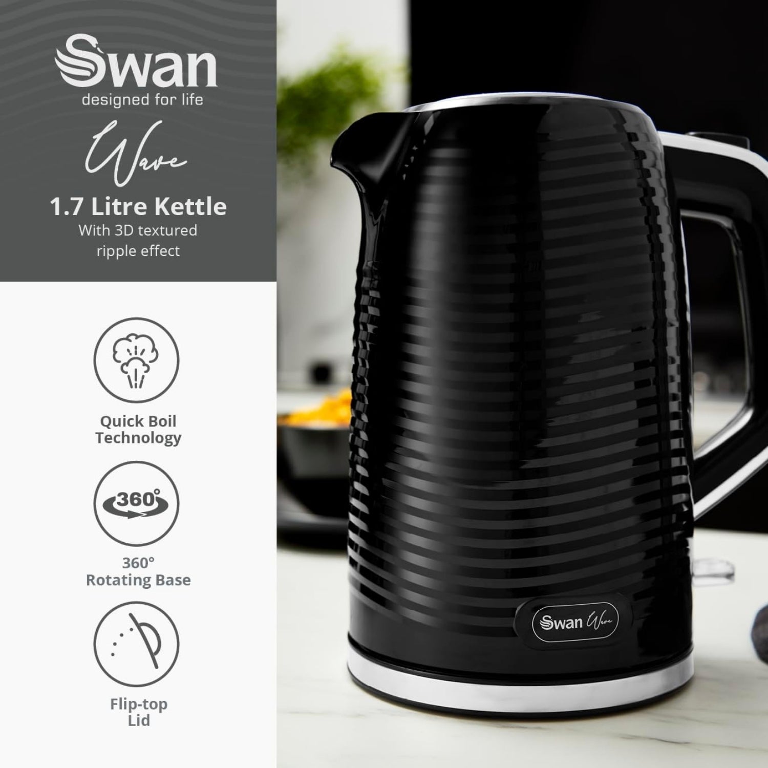 Enjoy the perfect drink to start your day the right way with this black electric kettle. It forms part of our new Swan Wave collection, which features a unique 3D textured wave design with sleek chrome accents to bring sophistication to any kitchen worktop. The cordless kettle has a large 1.7-litre capacity that makes up to 7 cups on one boil, so you can keep the teas and coffees flowing for your loved ones.