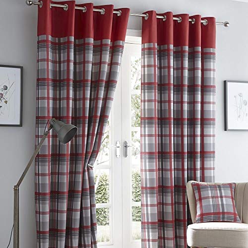 Tartan Check Lined Curtains Eyelet Ring Top 46x54" Red & Grey