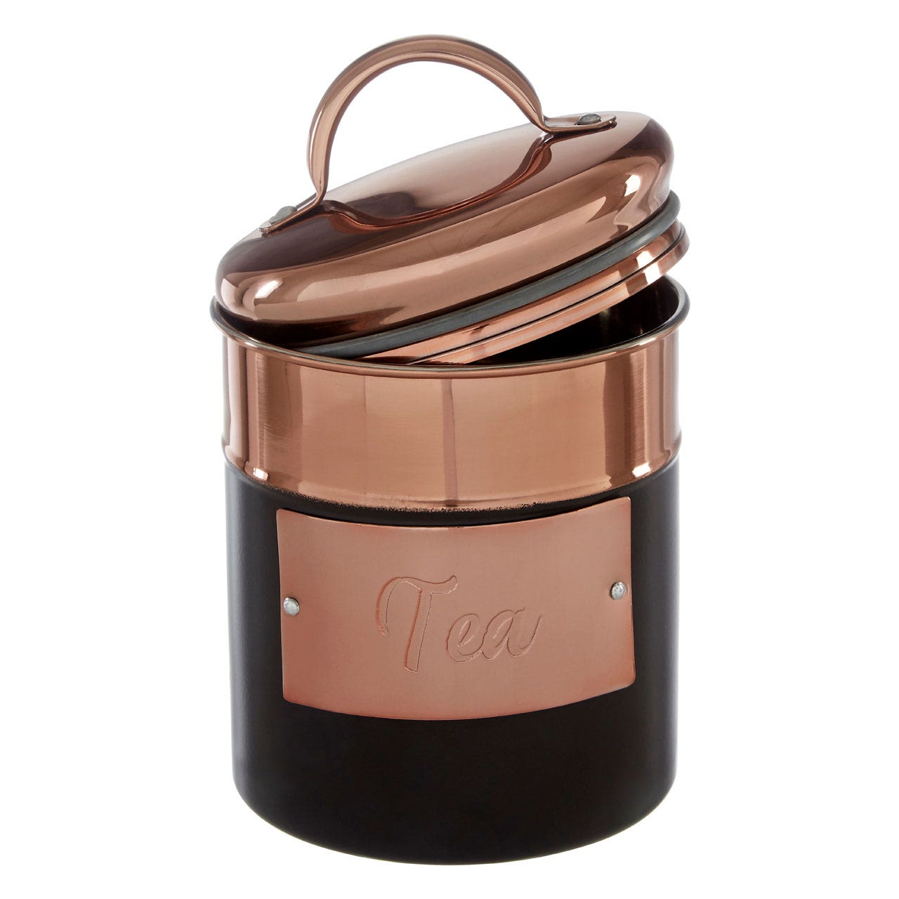 The jar is made from durable stainless steel and its lid has a raised handle for easy opening. A copper coloured steel plate is attached to its front and features embossed "tea" lettering.
