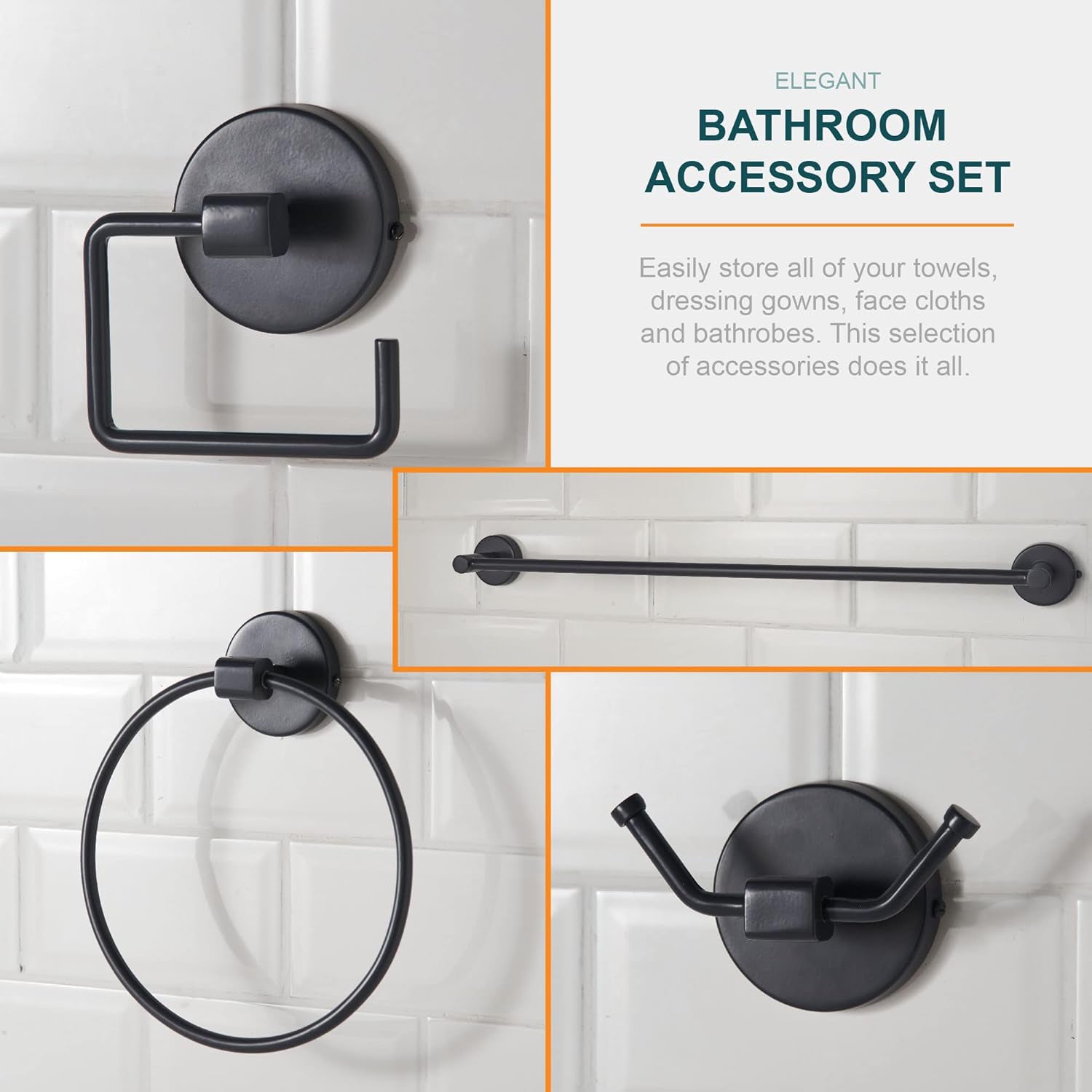 This eye-catching bathroom fixture set blends fashion and high-quality craftsmanship without going over budget. The modern set, which includes a towel rail, robe hook, towel ring, and toilet roll holder, maintains uniformity throughout. Use complementary fittings and accessory sets to add the final touches to your bathroom.