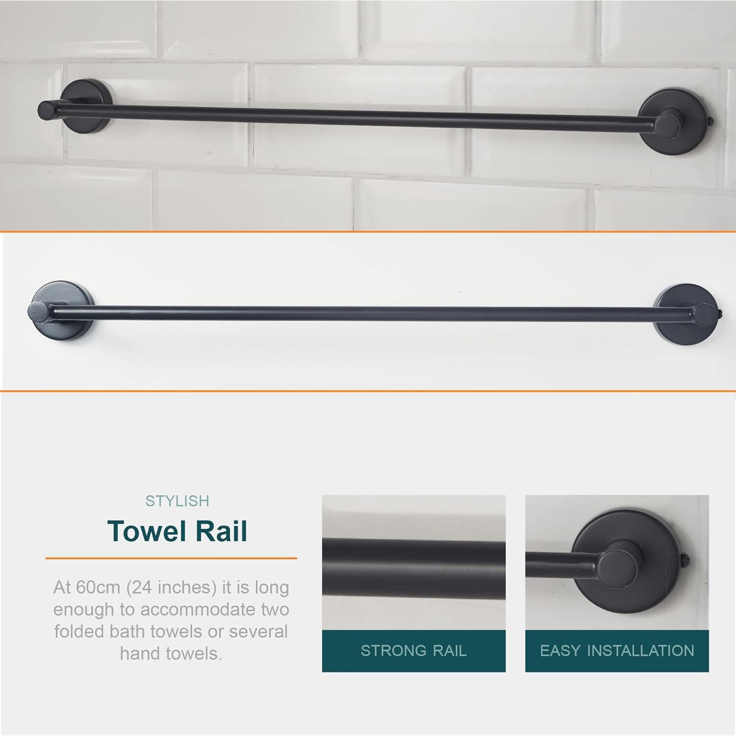 - Towel Rail - At 60cm (24 inches), it is long enough to accommodate two folded bath towels or several hand towels