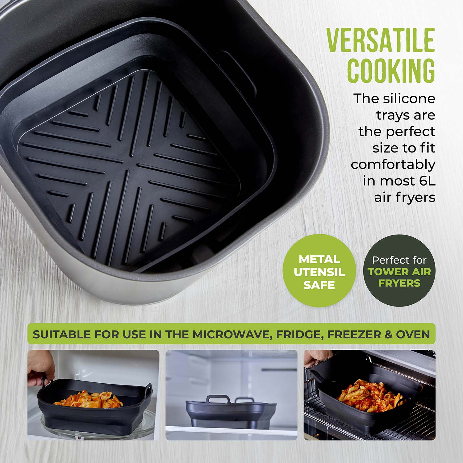 - Perfect for use in any 4L Tower air fryer or oven, the side handles make it easier to lift each tray out of the air fryer for added safety. The sealed base allows for a greater choice of delicious recipes, such as mouth-watering pasta bakes, succulent pies or juicy apple crumbles.