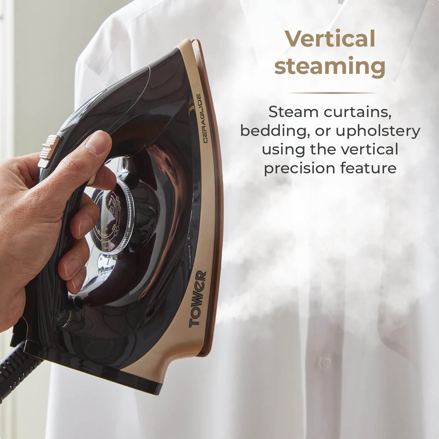 The ceramic double soleplate ensures the iron glides effortlessly over all types of fabric. For precision steaming large and small garments, the 80 g/min continuous steam output adds to the iron's ultimate performance, while the 3 bars of steam pressure add moisture to the fabric to make removing creases effortless. Taking conventional ironing to the next level, you can target creases in thicker, larger garments such as curtains, bedding, and upholstery with the vertical steam setting.