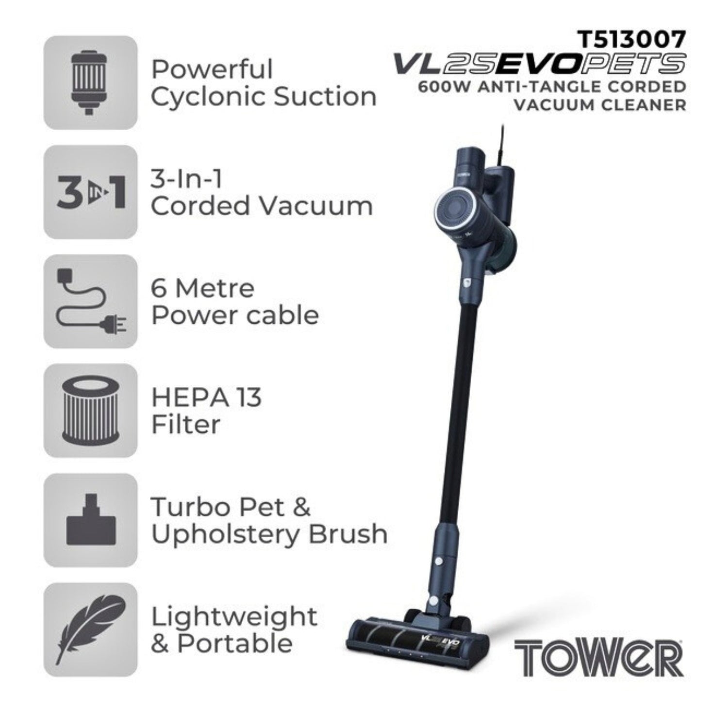 The Tower VL25 Evo Pets 3-in-1 Corded Vacuum Cleaner is a lightweight yet powerful solution for everyday cleaning. Designed with pet owners in mind, it features an anti-tangle pet tool that effortlessly removes stubborn hair from carpets and furniture.