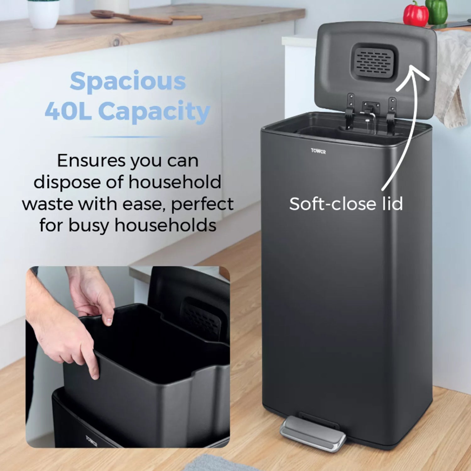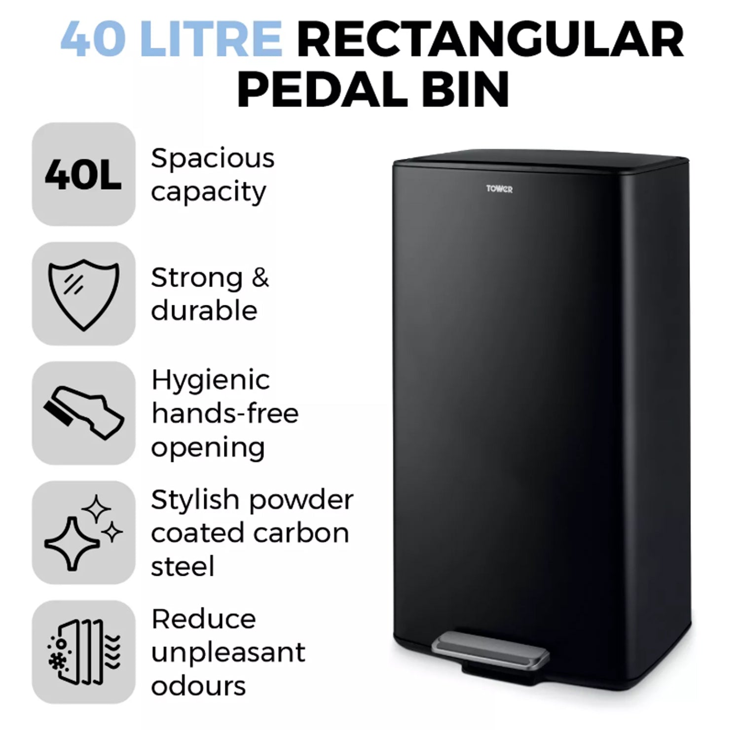 The Tower 40L Rectangular Pedal Bin combines practicality with sleek design, making it a perfect addition to any modern kitchen. Its large 40-litre capacity is ideal for busy households, while the hands-free pedal and soft-close lid ensure hygienic and quiet use.