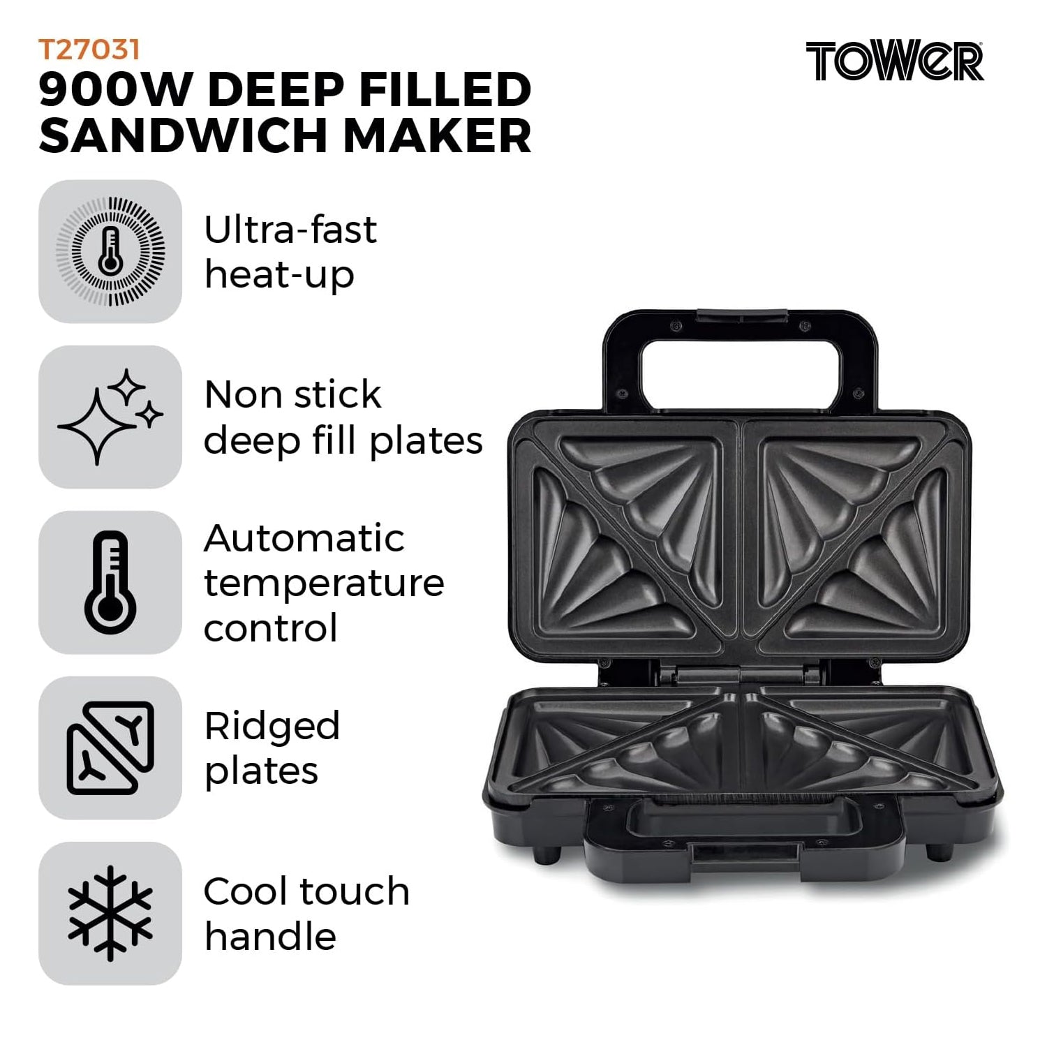 Upgrade your sandwich-making game with this 900W Deep Filled Sandwich Maker. Built with a sleek stainless steel exterior and extra-deep non-stick plates, this appliance lets you stuff your toasties to the brim without compromising on cooking reliability or safety.