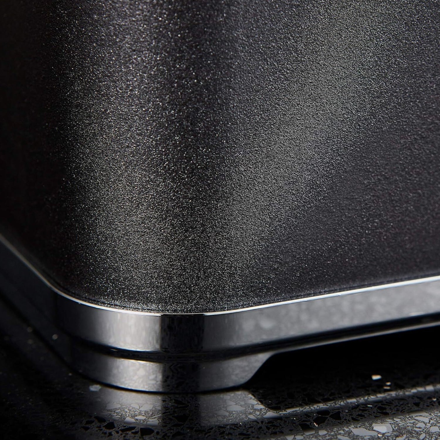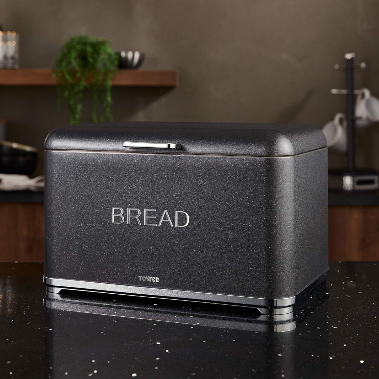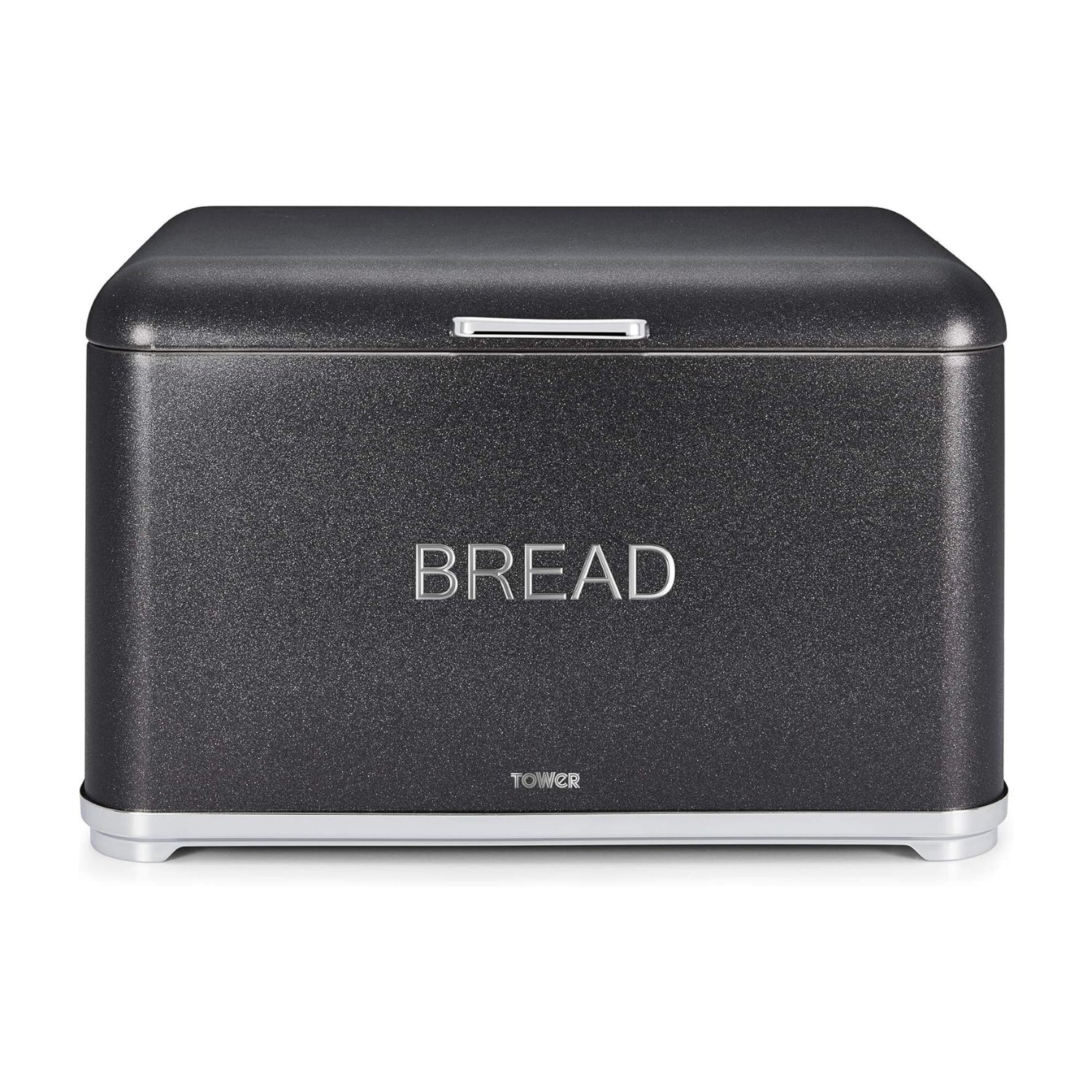 Add some glamour to your kitchen with this stylish black bread bin from the Tower Glitz range. The sparkling glitter-like design is complimented by a chrome base and handle, providing a contemporary look and feel that makes a statement. Its rectangular shape and large capacity provide enough space to fit a wide range of different-sized delicious baked goods, including bread, muffins, and crumpets, all of which will be neatly stored away and kept fresh.