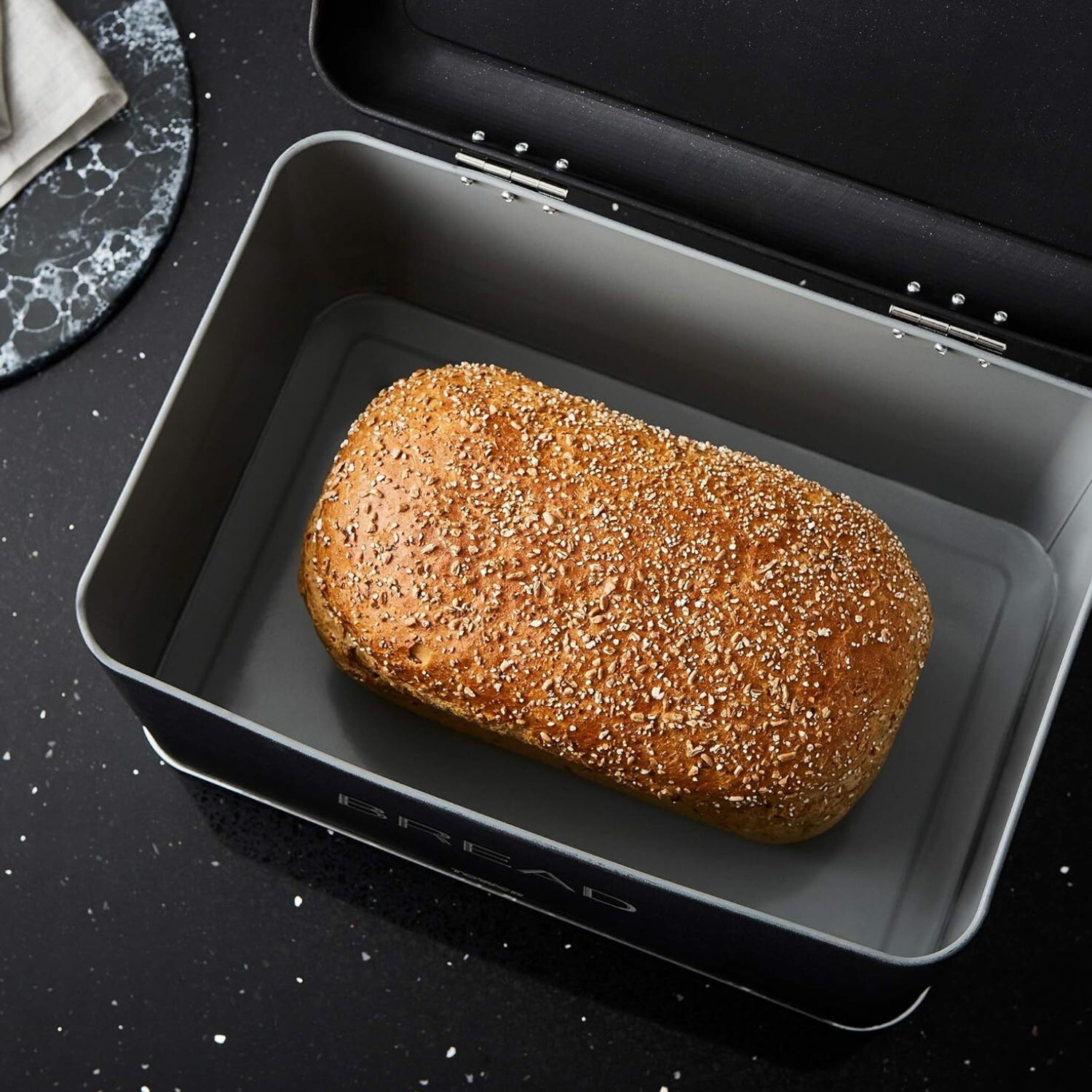 - The bread bin features a hinged lid with chrome accents, allowing for smooth opening and closing while keeping your bread fresh and protected from air exposure.