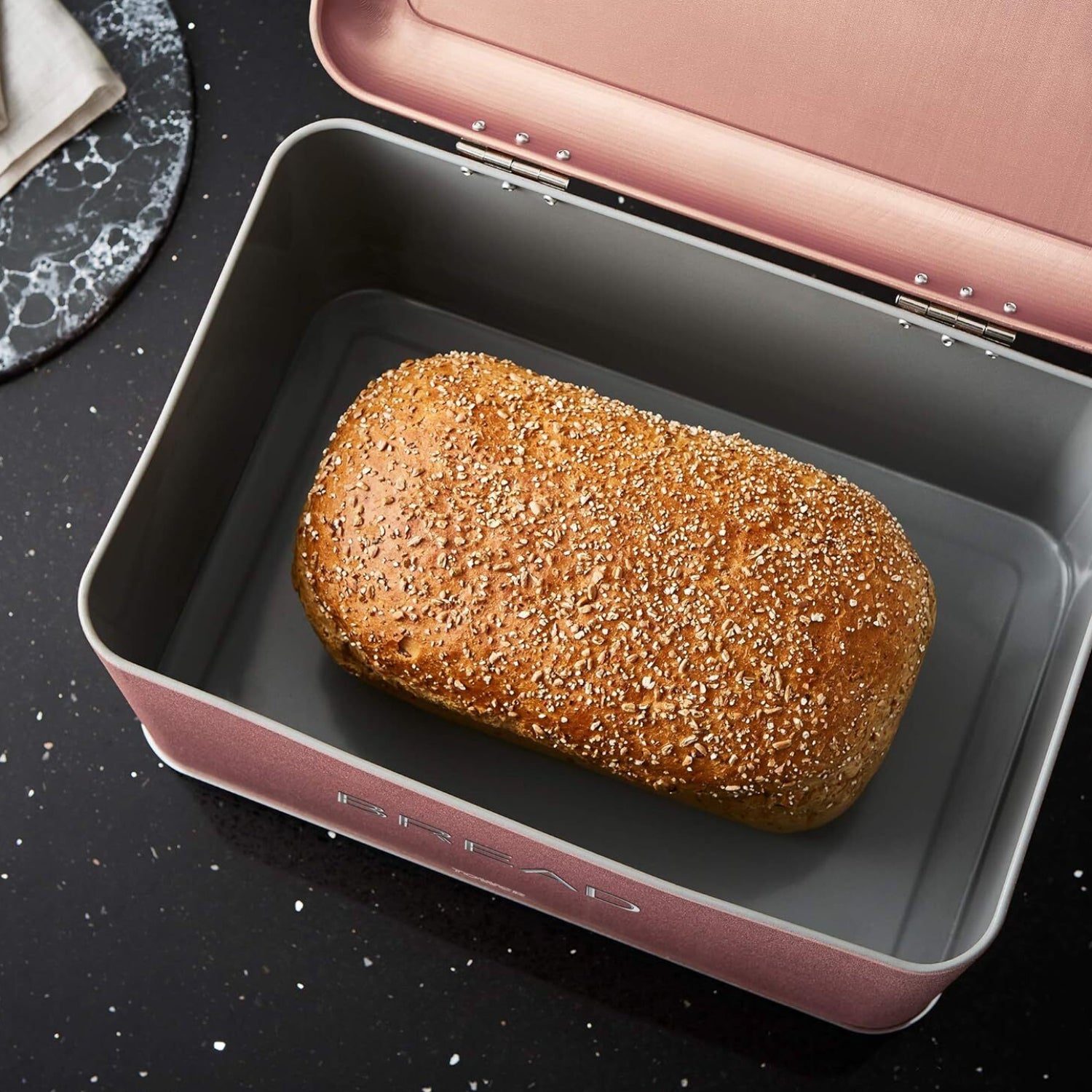 - The bread bin features a hinged lid with chrome accents, allowing for smooth opening and closing while keeping your bread fresh and protected from air exposure.