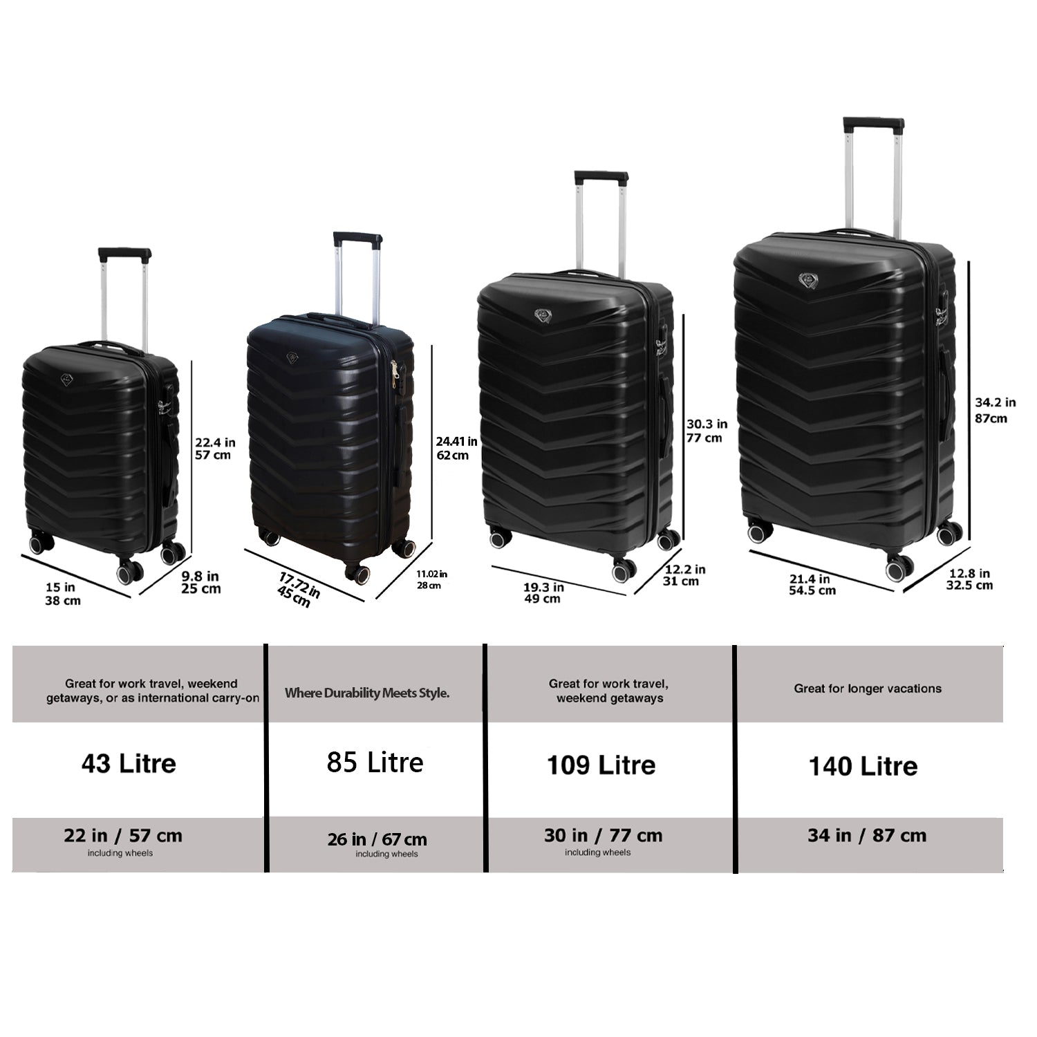 - 4-Piece Set: Includes 1pc 43-Litre capacity Suitcase (H: 57 x W: 38 x D: 25cm); 1pc 85-Litre capacity Suitcase (H: 67 x W: 45 x D: 28cm); 1pc 109-Litre capacity Suitcase (H: 77 x W: 49 x D: 31cm); 1pc 140-Litre capacity Suitcase (H: 87 x W: 54.5 x D: 32.5cm)