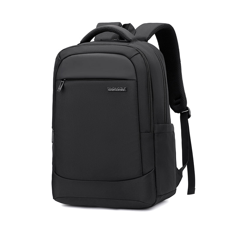 Elevate your daily commute and business travel with the Black Laptop Backpack. This scratch- and water-resistant Nylon exterior features a spacious main compartment with a dedicated, padded laptop sleeve to keep your tech secure (Fits up to 15.6" laptops). The polyester-lined interior offers ample room for books, documents, and accessories. The bag also features a luggage trolley sleeve, allowing you to stack the bag on your rolling suitcase, and an adjustable chest strap to stabilize the load on your back.