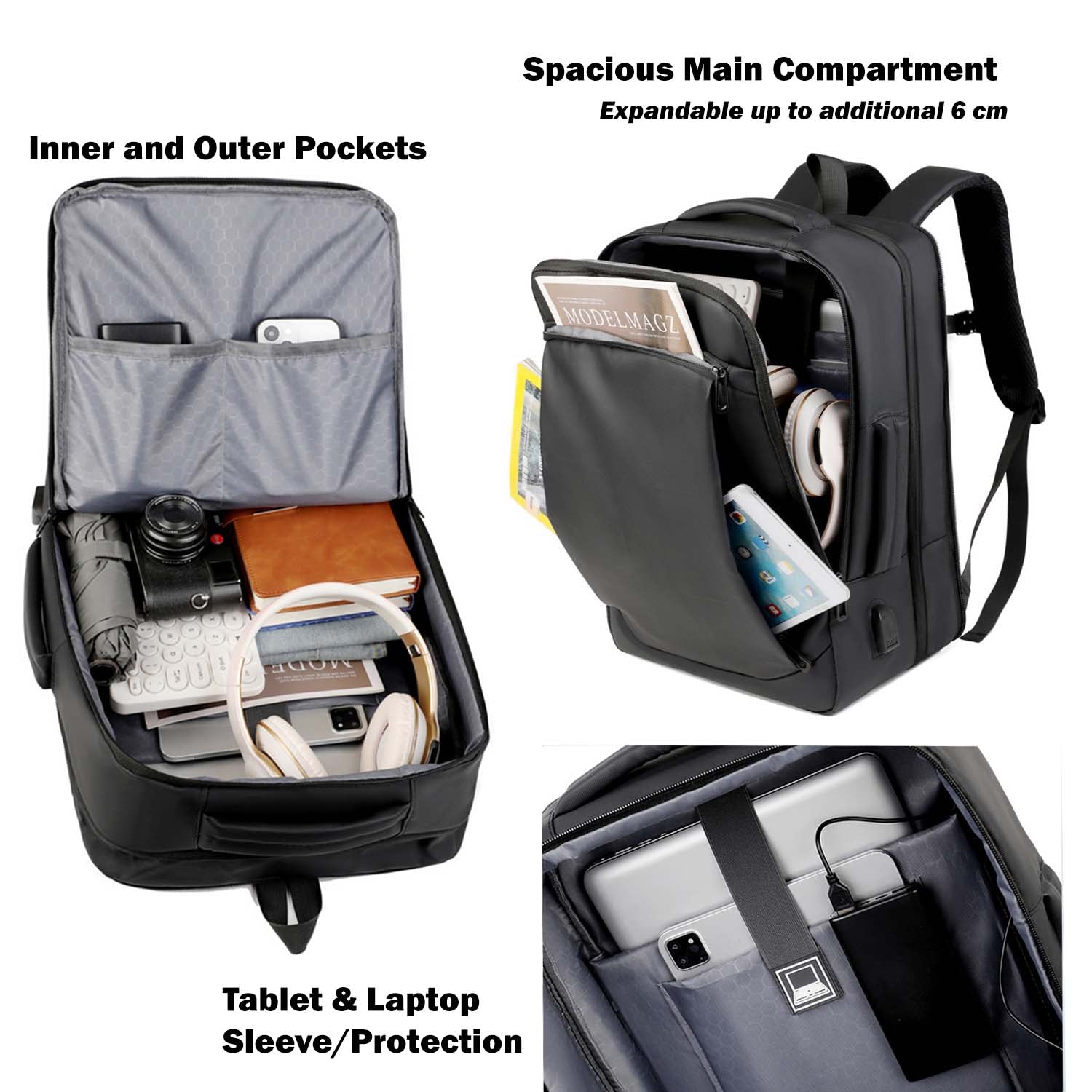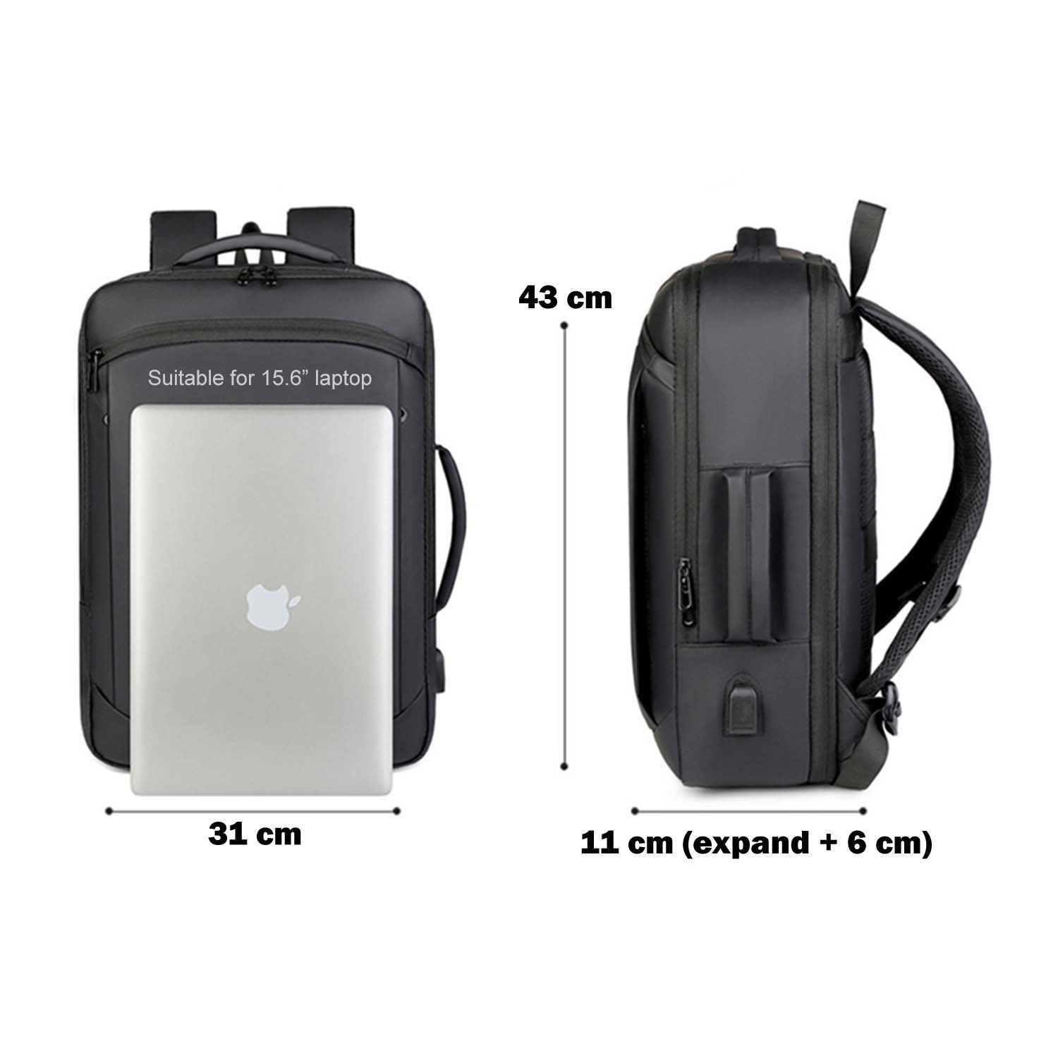 Expandable Black Fits 15.6" Laptop Backpack with USB Port