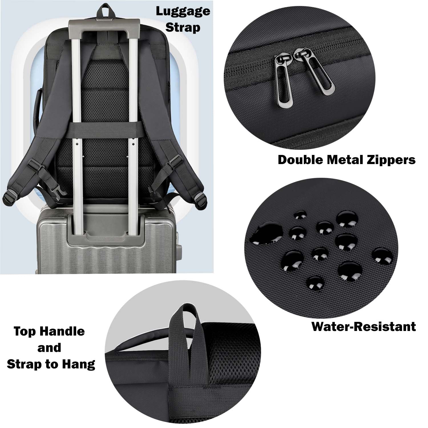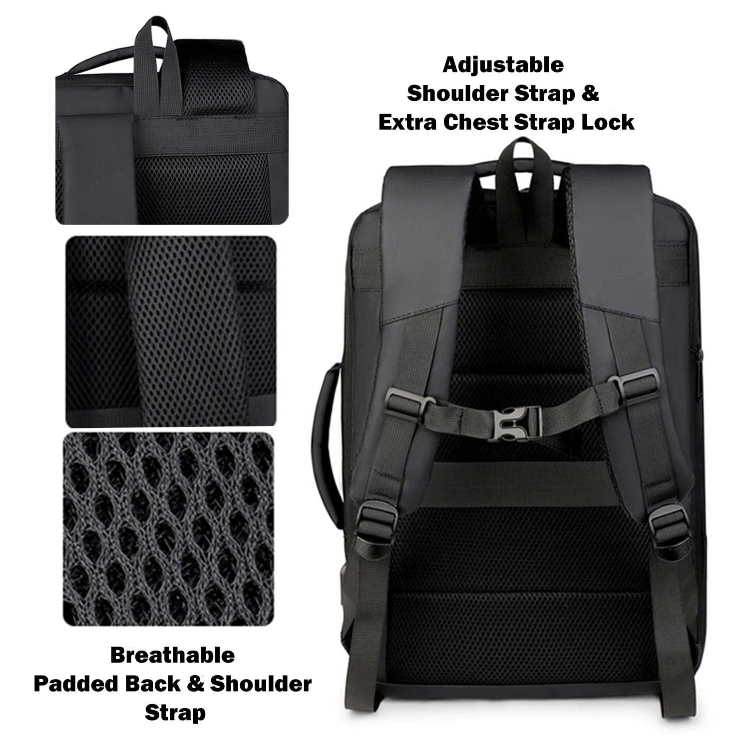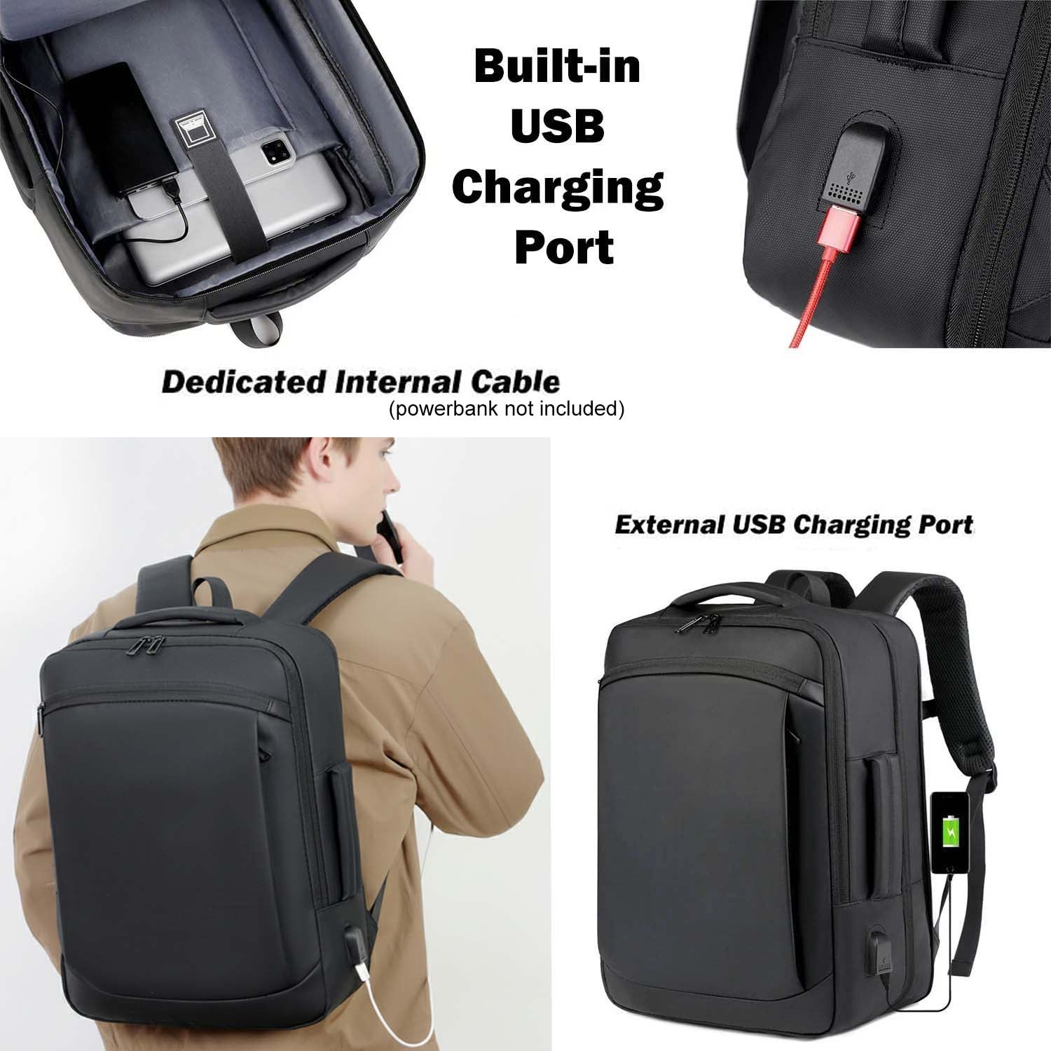 - Built-in USB charging port for on-the-go convenience (power bank not included); breathable padded back and adjustable shoulder straps with extra lock; luggage strap for suitcase attachment;