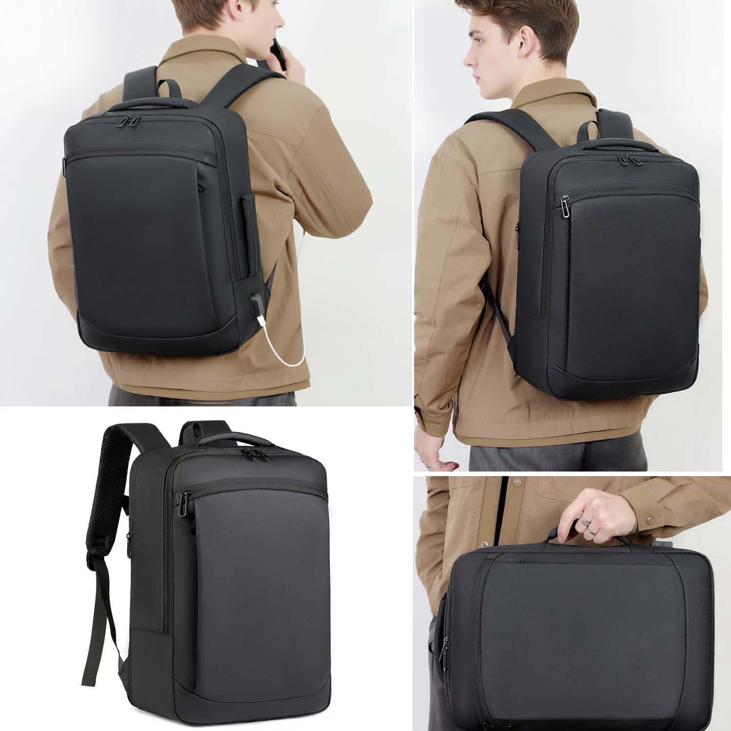 - Modern rectangular shape, minimalist black aesthetic that converts easily between a traditional backpack & a briefcase-style carry (via the top and side handles); with double zippers.