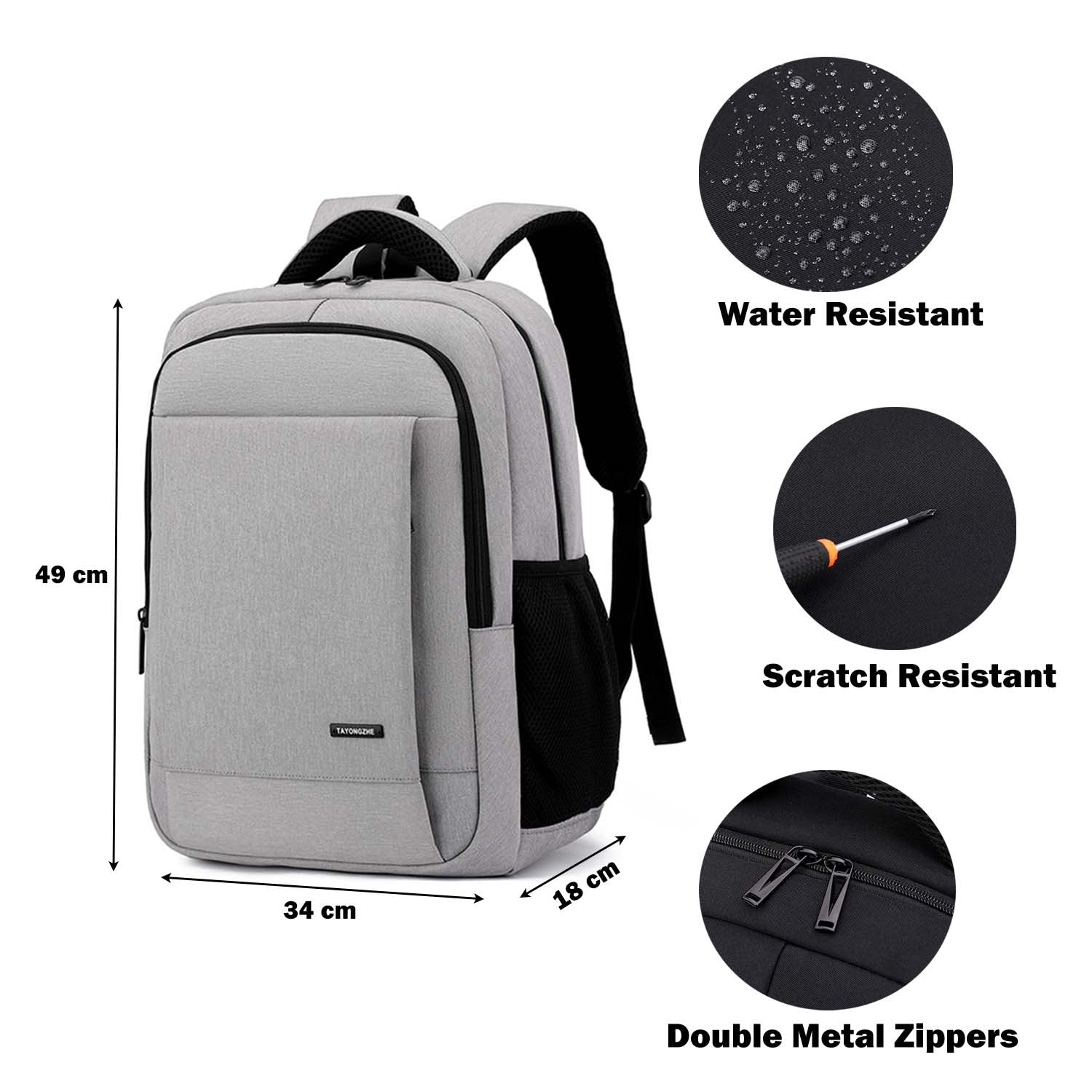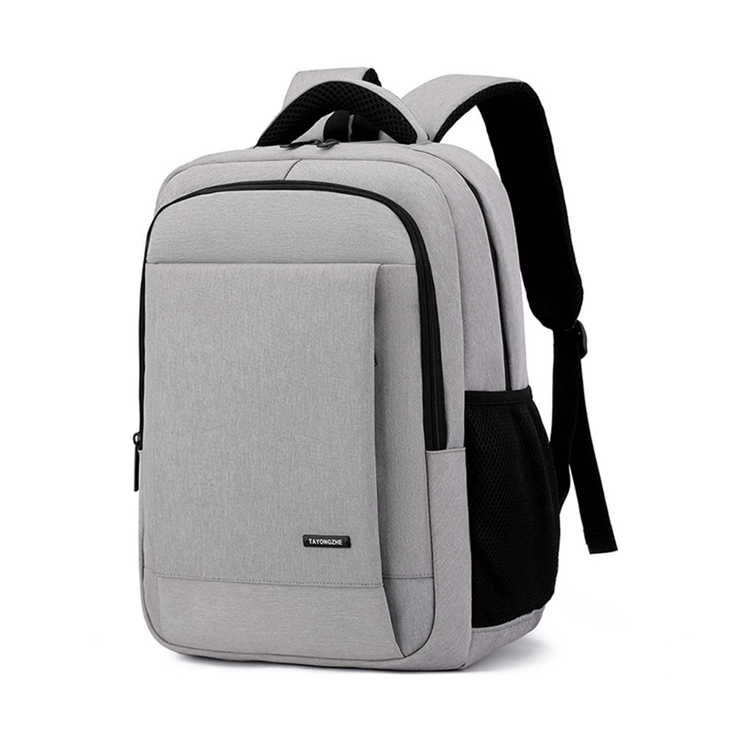Travel and work in style with the Laptop Backpack, designed for professionals, students, and frequent travellers. Its sleek light grey design features double metal zippers, mesh side pockets for bottles or umbrellas, and a dedicated padded laptop sleeve with a Velcro strap to lock your device in place (Fits up to 15.6" laptops). The breathable mesh back panel prevents overheating during long commutes.
