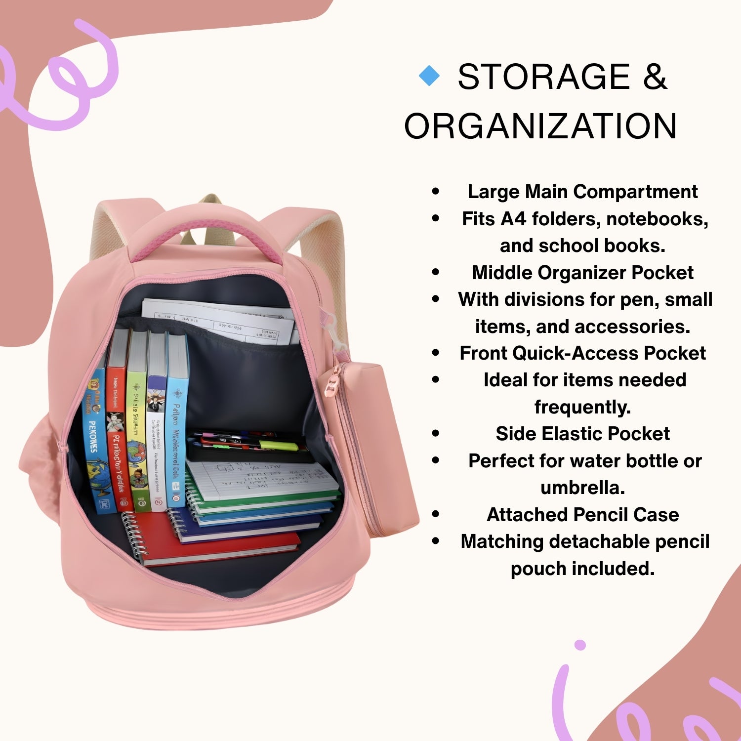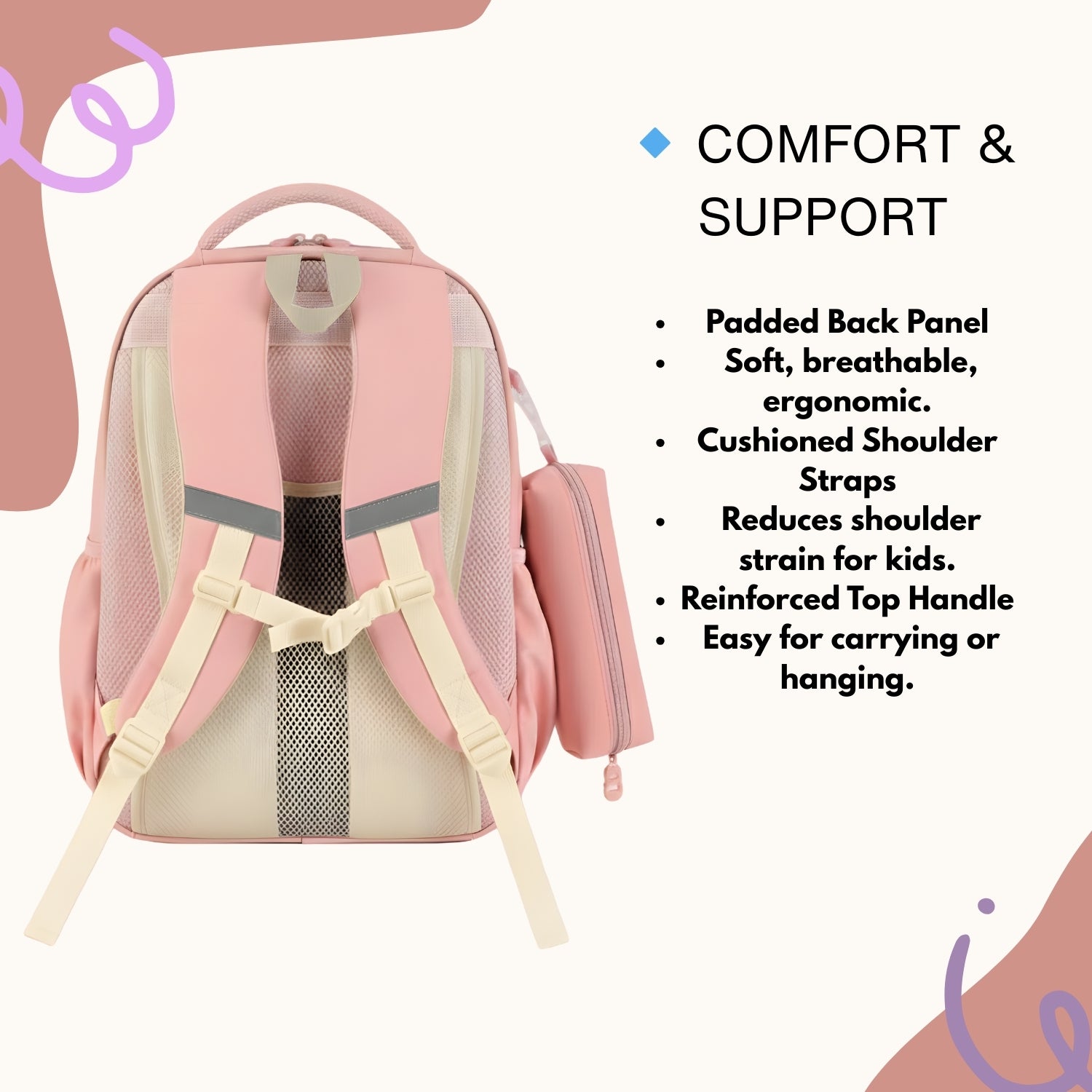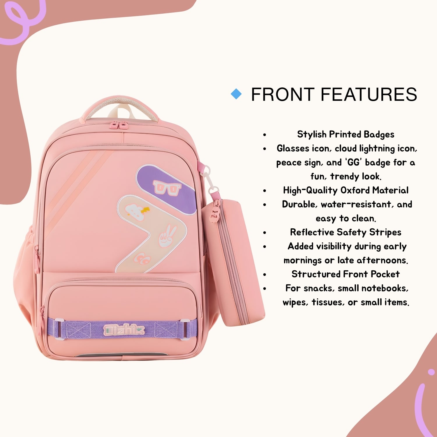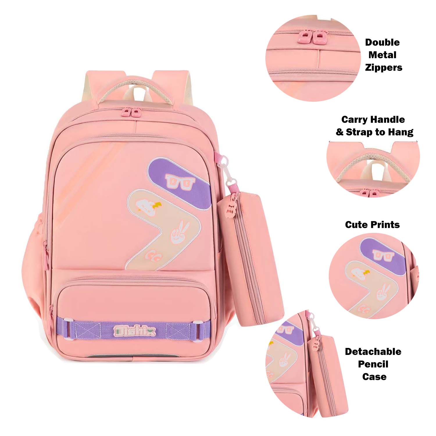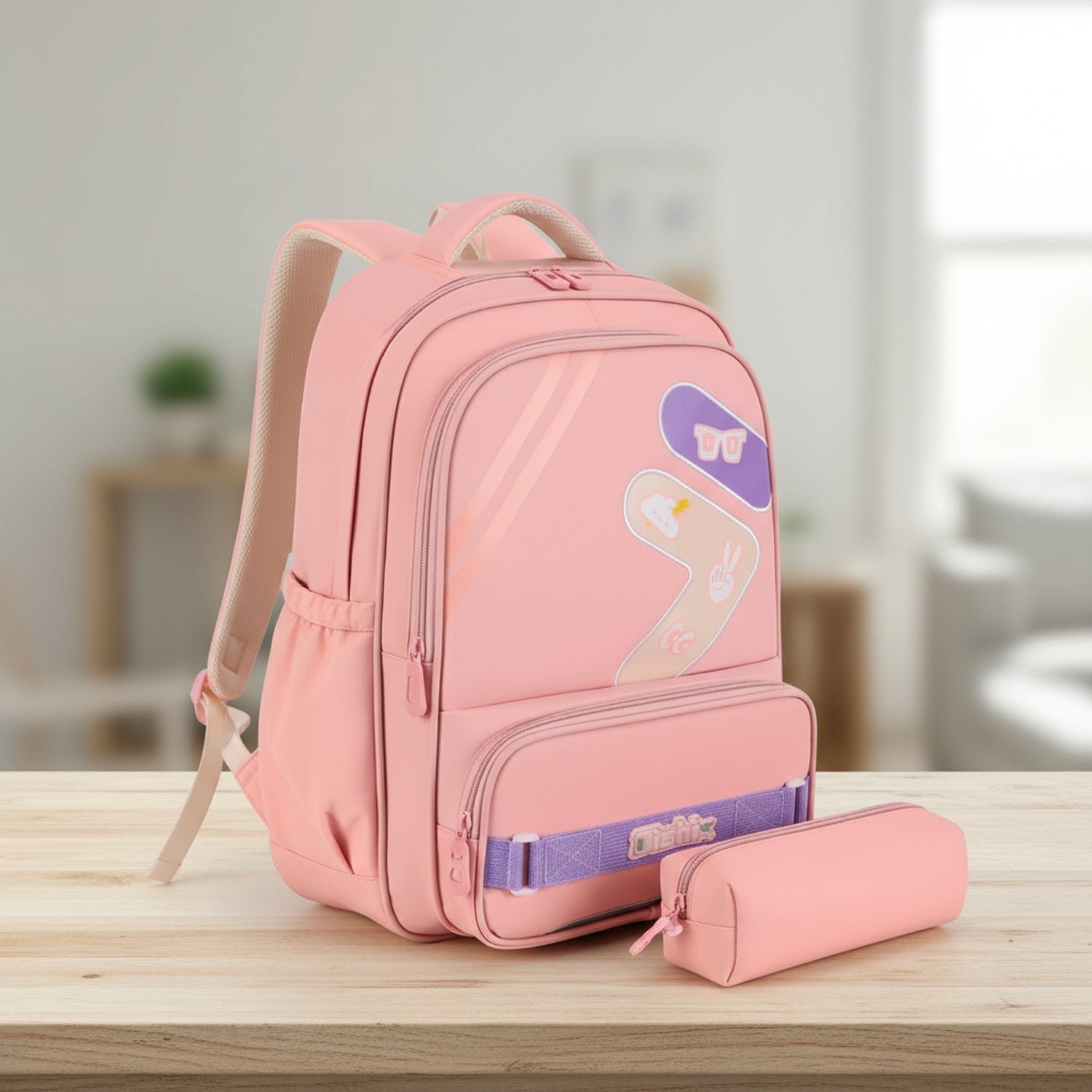 Add style and functionality to school days with the Pink School Backpack, designed for students who love organization and comfort. Made from durable nylon with reinforced stitching, this backpack features a matching detachable pencil case, double zippers, and multiple compartments including an inner pocket and front pocket for easy access. Elasticized side pockets hold bottles or umbrellas securely, while breathable padded straps ensure all-day comfort. Perfect for school, travel, or casual use.