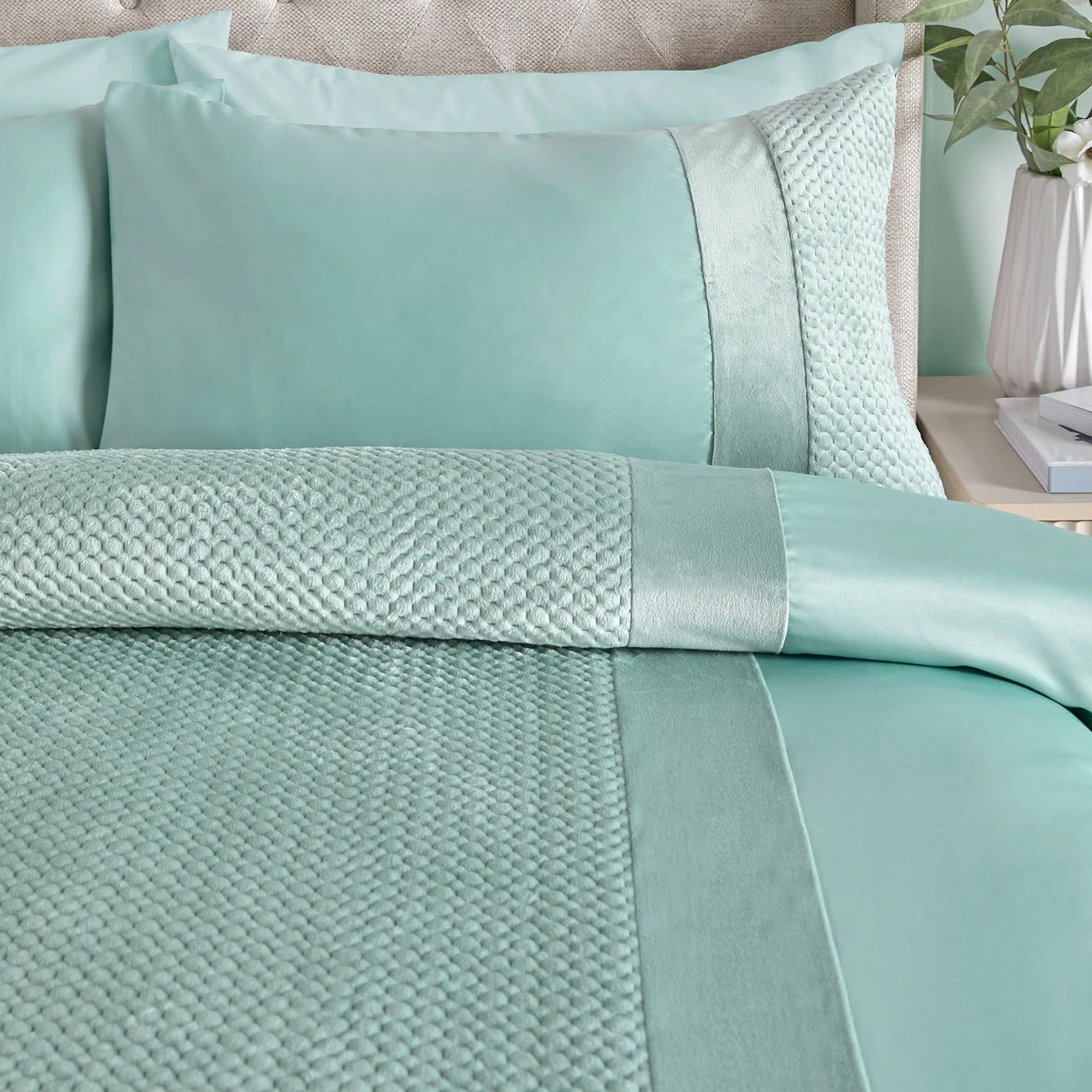 Velvet Satin Duvet Cover Set with Pinsonic Quilt Detail, King, Duckegg