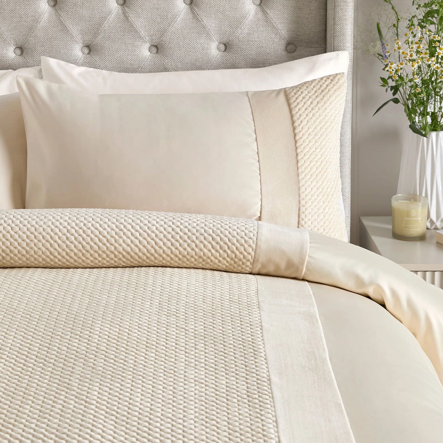 Velvet Satin Duvet Cover Set with Pinsonic Quilt Detail, Super King, Natural