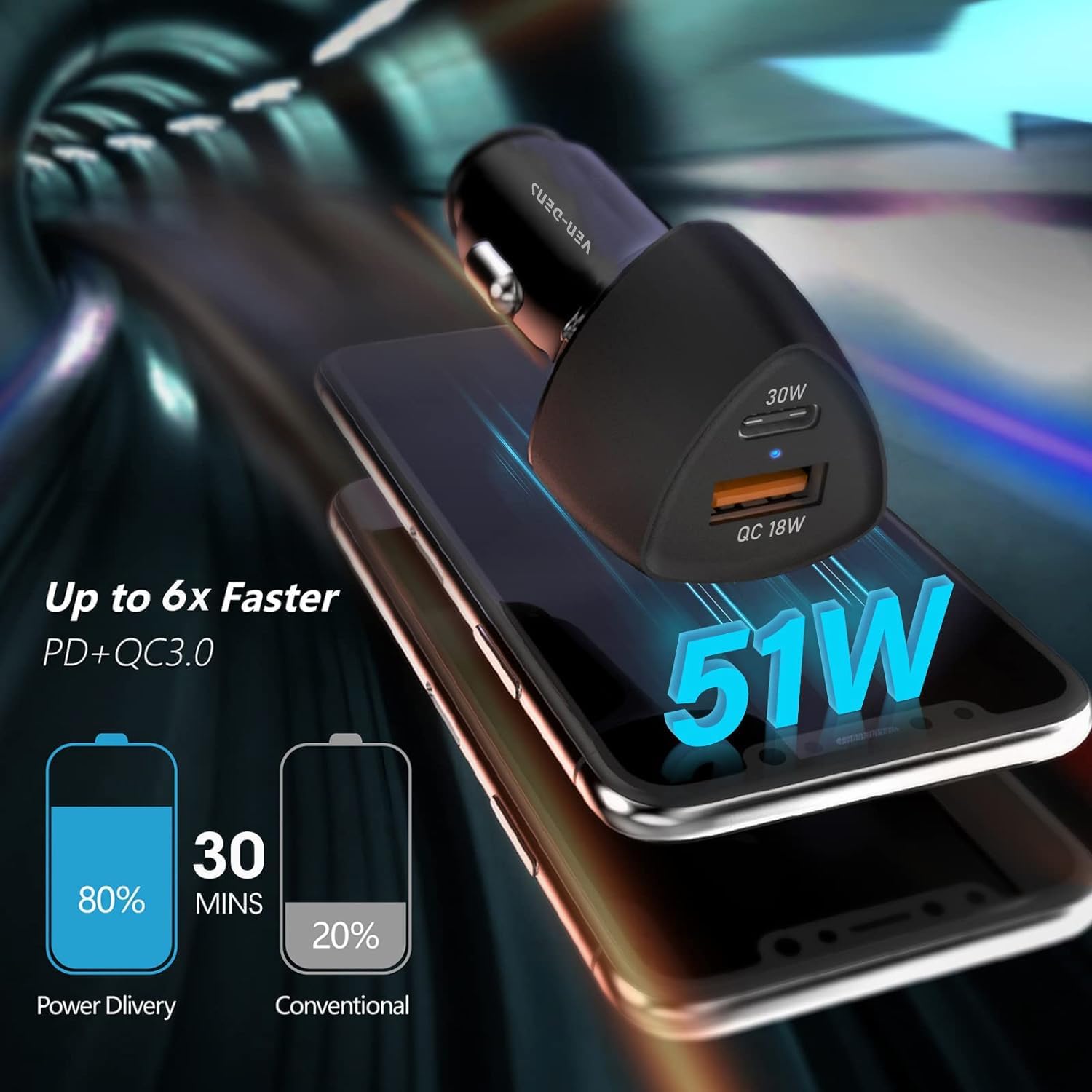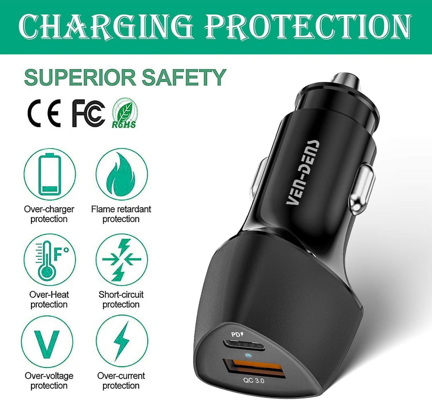 VEN-DENS Black 38W Type-C & USB PD Dual Port Car Charger Adaptor