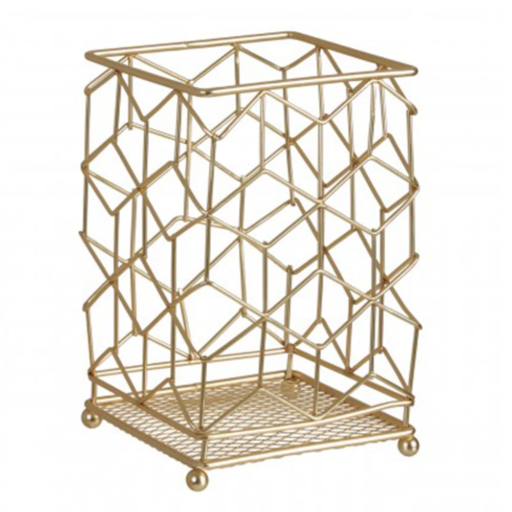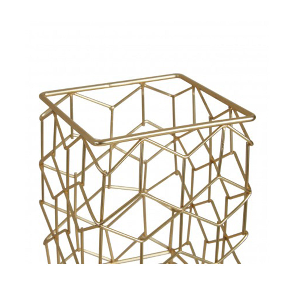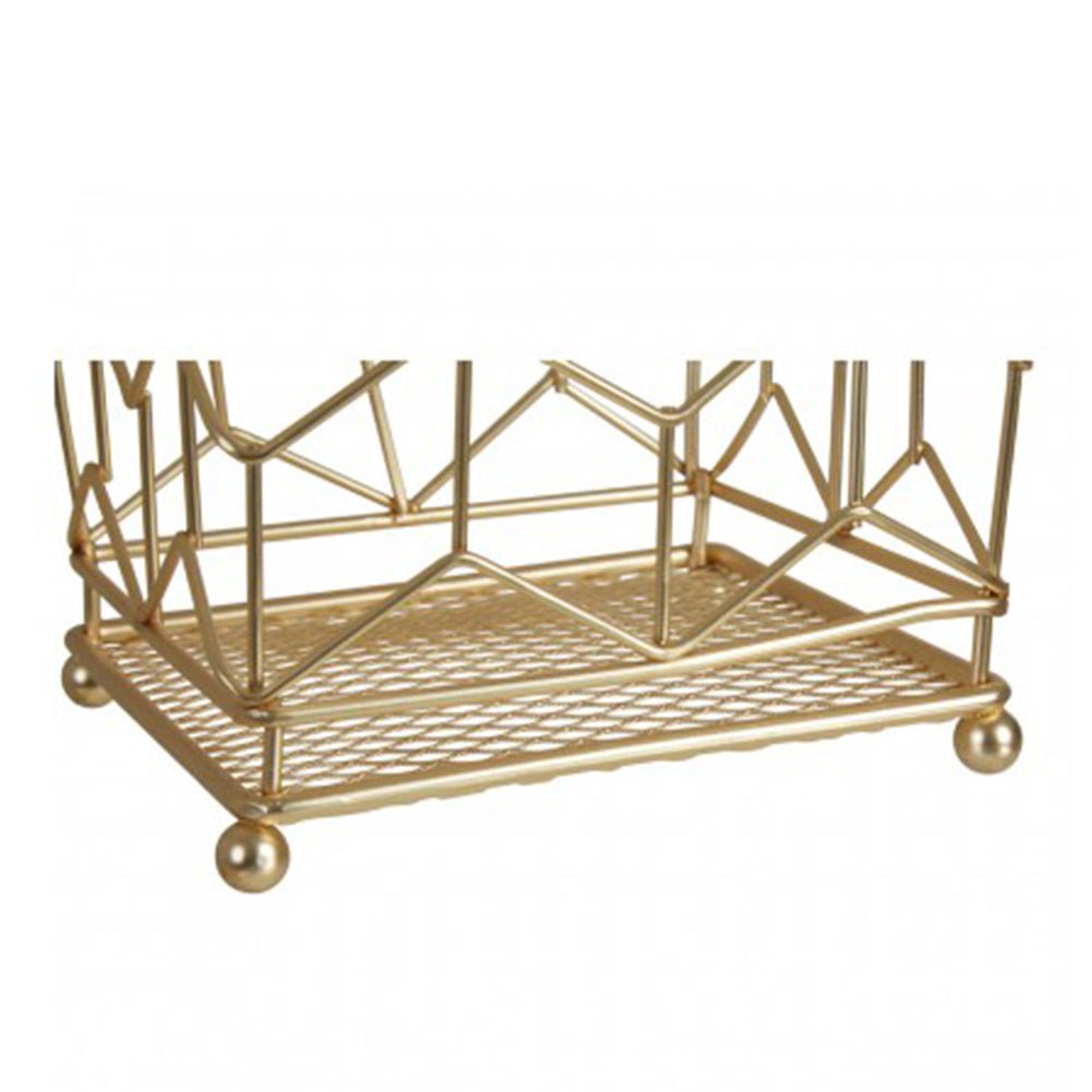 Crafted from metal wire, the Vertex Contour Utensil Holder in matte gold finish features a geometric pattern.