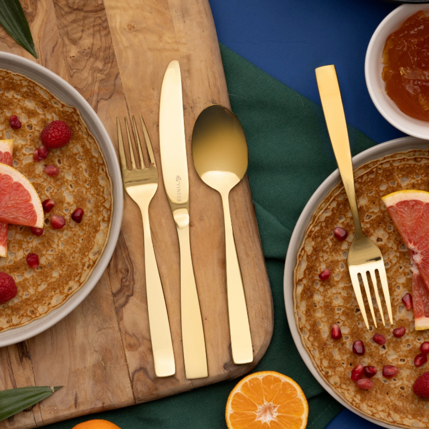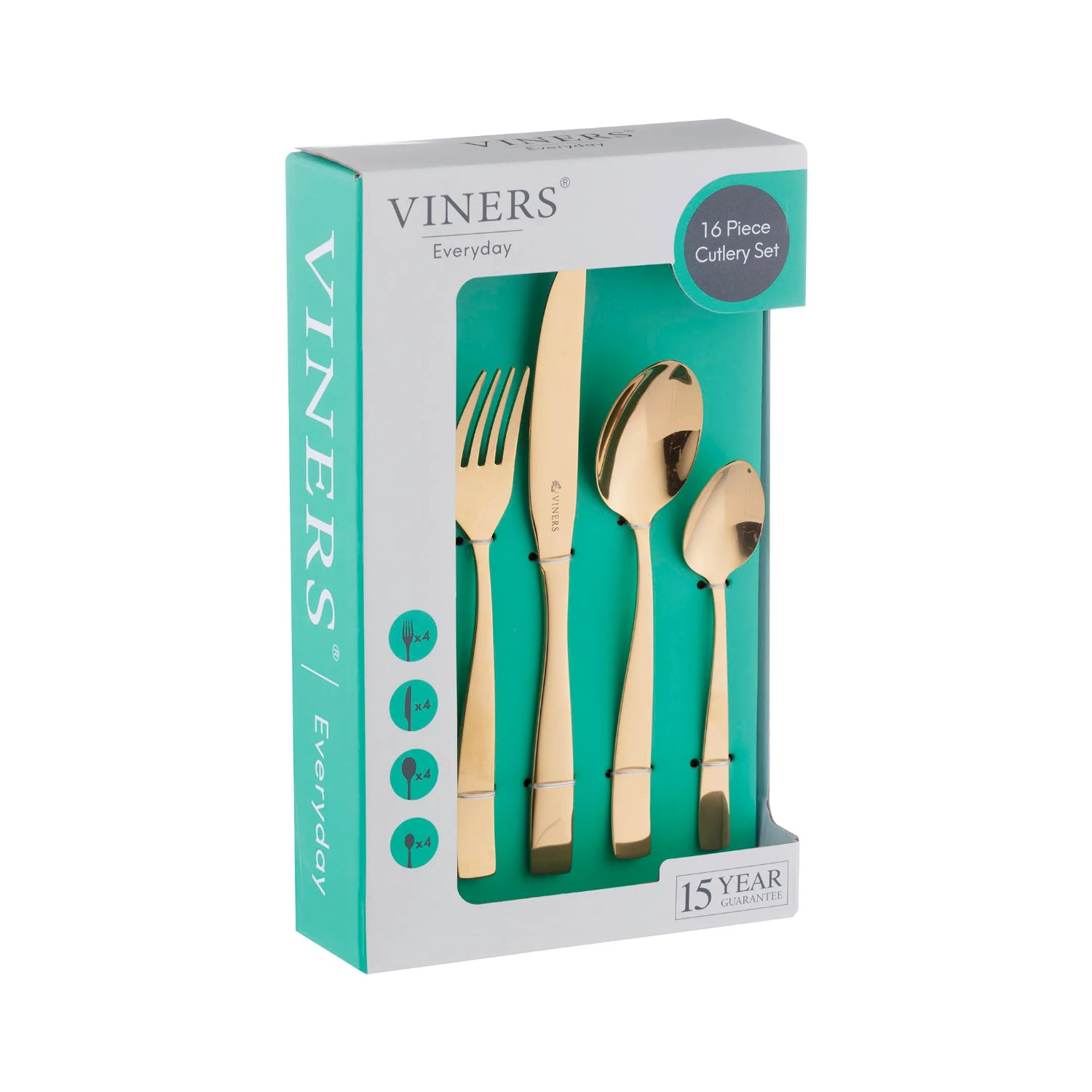 Viners® Purity Gold 16-Piece Cutlery Set is enviably stylish. Each piece is expertly balanced with simple, smooth, flared handles and an elegant design.