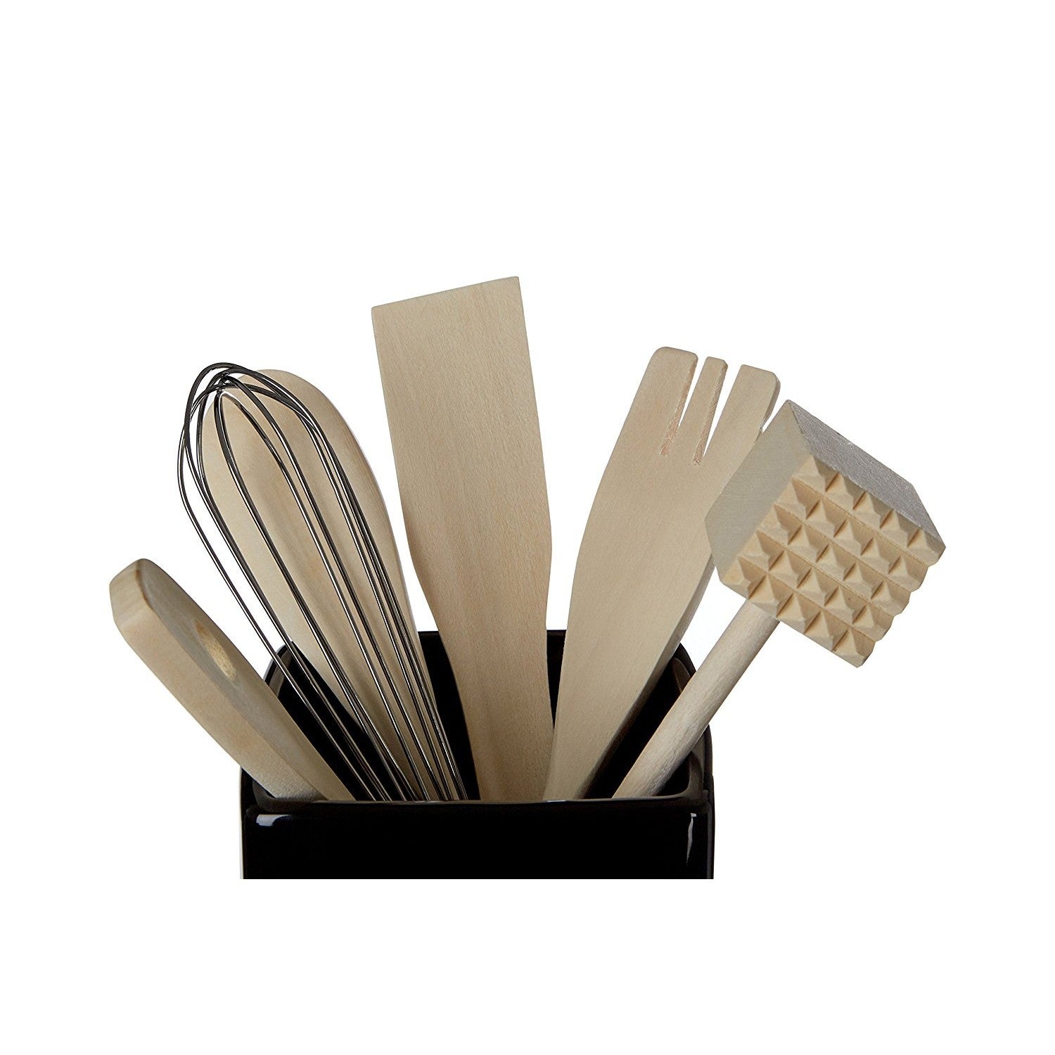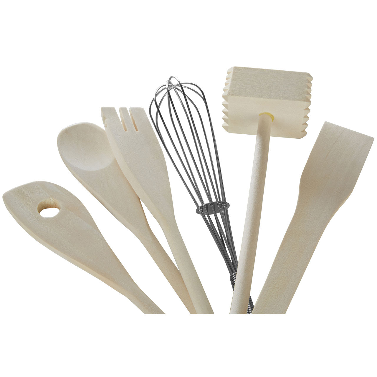 - Includes 2 wooden spoons, a wooden spatula, a wooden meat tenderizer, a wooden fork, and a metal whisk