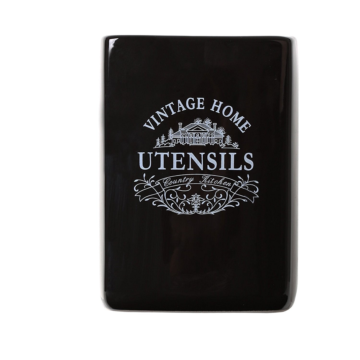 Made from strong, smooth ceramic, this utensil holder can be coordinated with other kitchen accessories from the Vintage Home range. Its black finish accentuates the rounded edges that soften its square shape. White lettering and graphic detail add to its rustic appeal. Designed to help minimize clutter in the kitchen, use it to keep a variety of cooking tools accessible.
