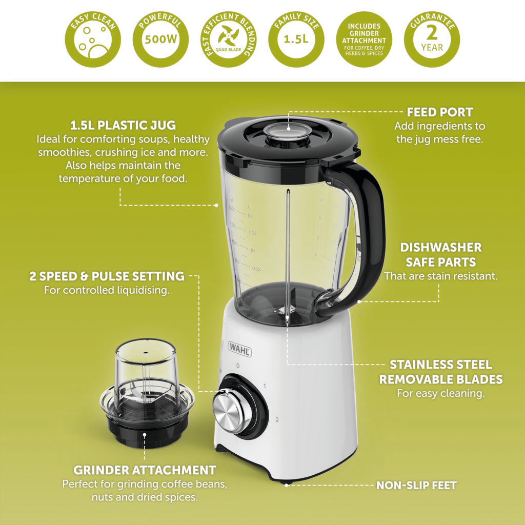 The WAHL 500W Table Blender with Grinder is the perfect kitchen tool for making healthy smoothies, blending comforting soups and delicious sauces, crushing ice, and much more. This powerful blender comes with a 1.5-litre plastic jug to fit all your contents and has dishwasher-friendly parts for easy maintenance, along with easy-clean removable stainless-steel blades. The plastic glass jug resists stains and helps maintain the temperature of your food. The additional grinder attachment is perfect for grinding coffee beans, nuts, and dried spices.